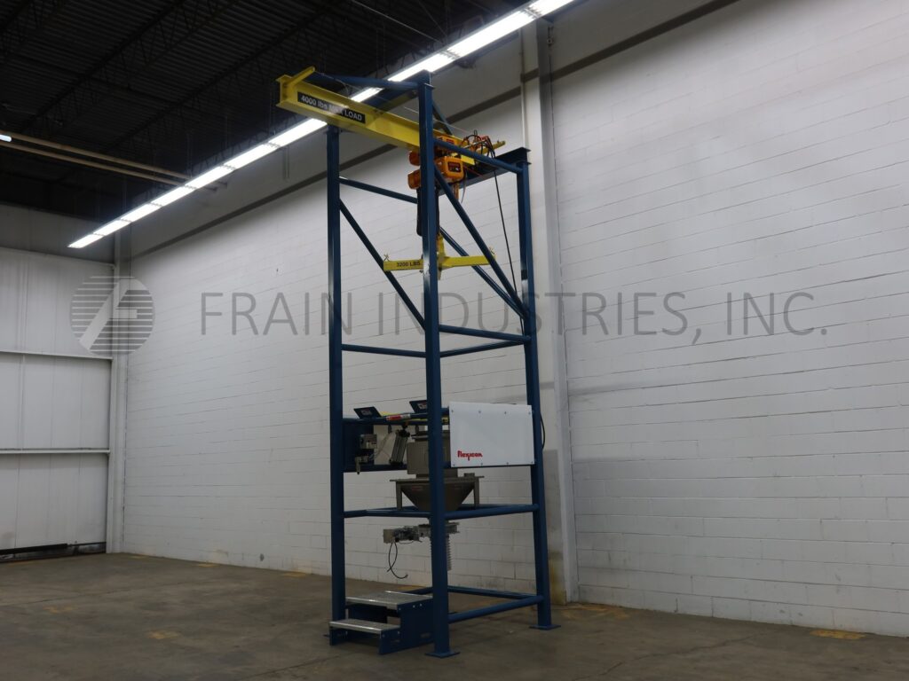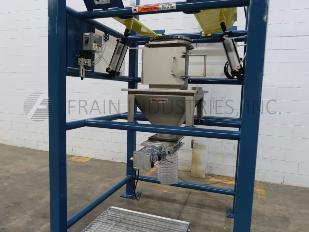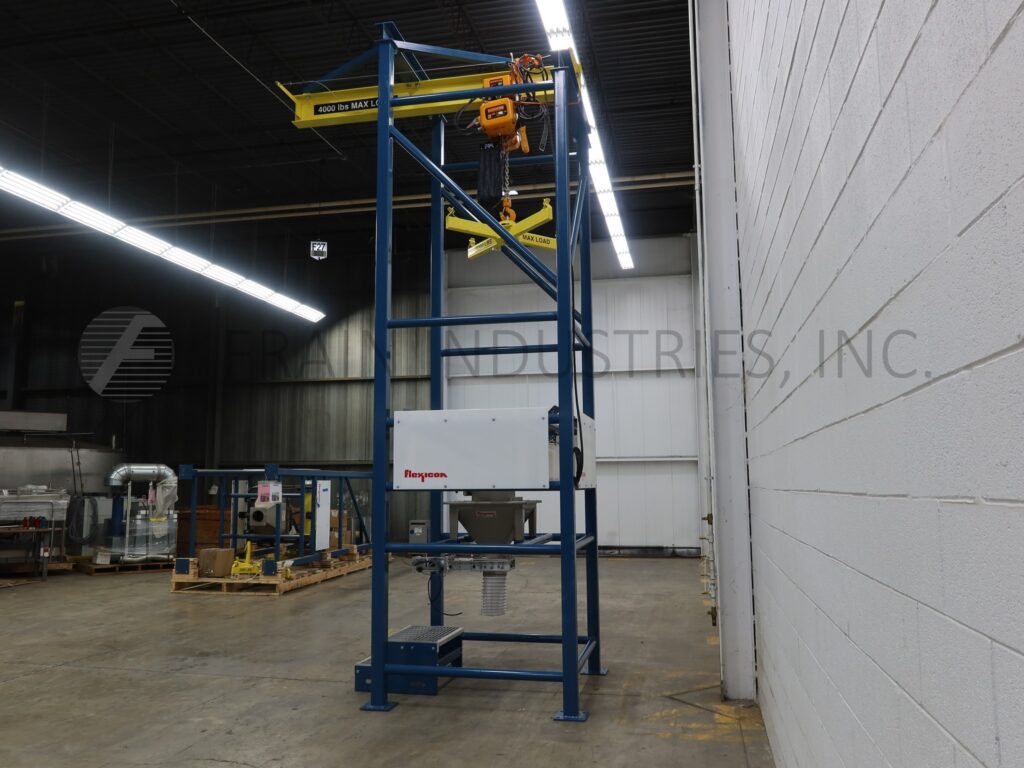 Back to All EquipmentFlexicon, Model BFC-C, Bulk bag, super sack unloading system. Equipped with 109" long cantilevered I-beam extending 45" beyond frame, spider lift bag attachment rated to 3200 lbs., powered hoist and trolley, bag massagers, and 12" iris valve to secure sac chute and 3 ft³ hopper with 8" flanged outlet and slide gate valve.
