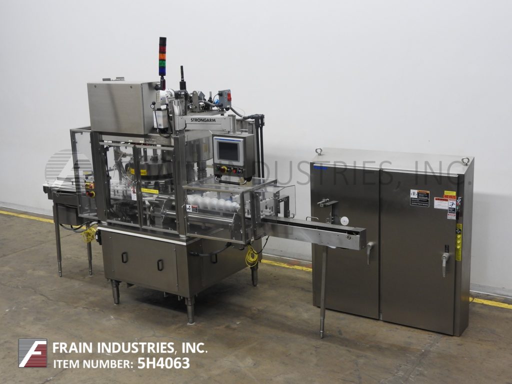 Back to All EquipmentFowler Model CAPDF-9/360, automatic, right to left, (9) head rotary, stainless steel, push-on capper designed to run insert and push-on style closures at rates from 9 to 325 containers per minute – depending on materials and application. Cap and Container sizes per application with proper change parts. Equipped with 180" long x 4" wide plastic interlock container belt conveyor with 32" long worm screw to star wheel container in feed and discharge, currently set for 63mm caps with no container / no cap, (9) push on capping heads with quick release gripper jaws set on 6" centers, with container sampling and rejection section. Strongarm swing arm and A/B touch pad controller with panel view and has control power on / off and cycle start, stop, reset and e-stop push bottons controls with A/B powerflex vari-speed controllers and interlock safety guarding. Mounted on stainless steel base frame with (4) height adjustable legs. Used for lids, fitments, plugs, overcaps, flip tops and roller ball applications and can handle glass, metal or plastic containers.