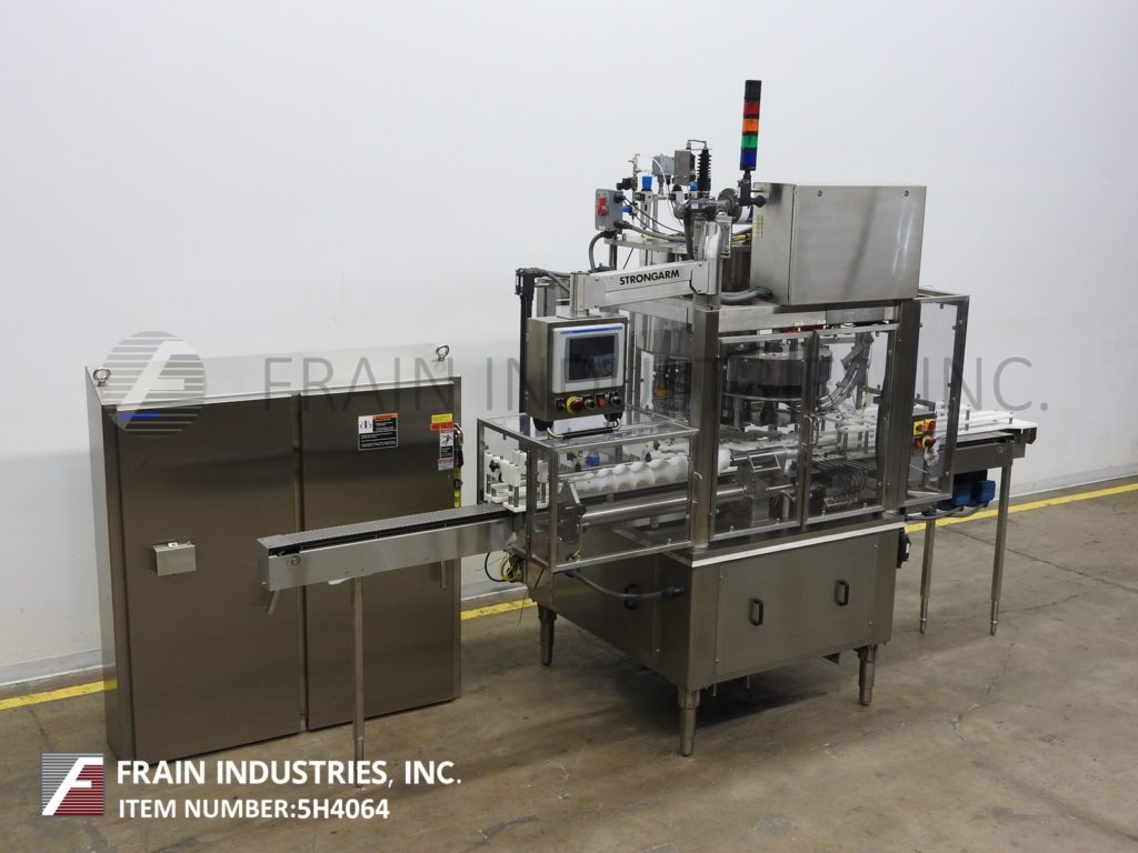 Back to All EquipmentFowler Model CAPDF-9/360, automatic, left to right, (9) head rotary, stainless steel, push-on capper designed to run insert and push-on style closures rated from 9 to 325 containers per minute – depending on materials and application. Cap and Container sizes per application with proper change parts. Equipped with 177" long x 4-1/2" wide plastic interlock container belt conveyor with 32" long worm screw to star wheel container in feed and discharge, cap chute currently set for 63mm caps with no container / no cap, (9) push on capping heads with quick release gripper jaws set on 5" centers, with container sampling and rejection section has 4-1/2" wide secondary cross over conveyor. Remote control panel has A/B CPU controller with on board Strongarm swing arm and A/B touch pad controller with panel view and has control power on / off and cycle start, stop, reset and e-stop push bottons controls with A/B powerflex vari-speed controllers and interlock safety guarding with statis light bar. Mounted on stainless steel base frame with (4) height adjustable legs. Used for lids, fitments, plugs, overcaps, flip tops and roller ball applications and can handle glass, metal or plastic containers.