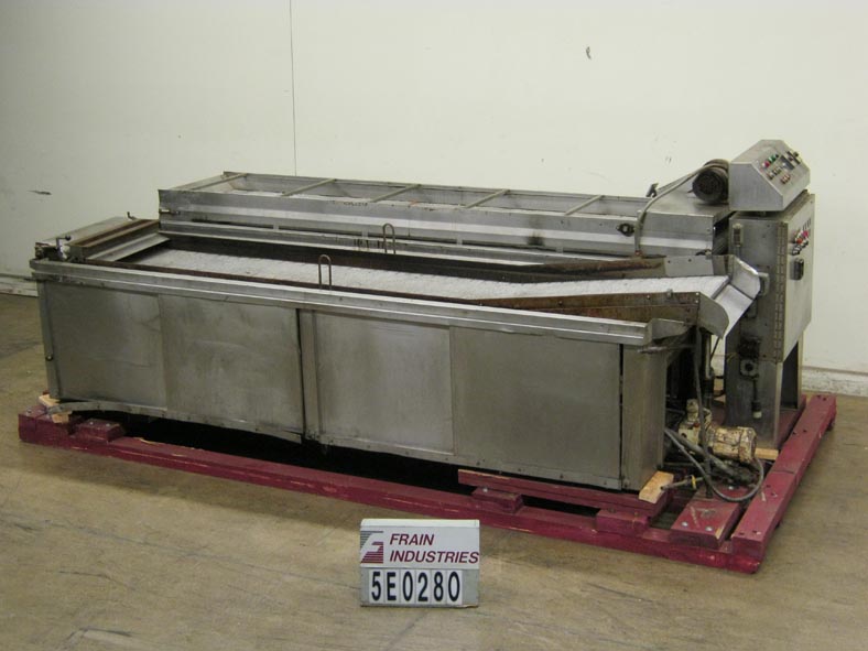Back to All EquipmentContinuous, oil circulation, roaster oven has a 154" L x 28" W stainless steel wire mess product conveyor belt, with 120" submerged roasting area, and 43" infeed and 49" discharge heights. Direct heating, promotes oil and product quality, and was last used for continous oil roasting of nuts, without cover.