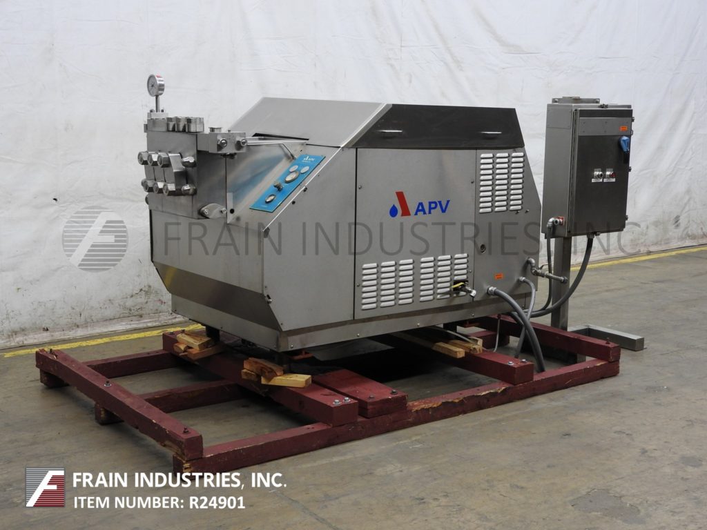 Back to All EquipmentGaulin, Model MS18-2.5TBS 2200, single stage, stainless steel homogenizer. Rated for an output capacity of 10 to 1600 gallons per hour – depending on materials and application. Maximum operating pressure up to 2,200 psi. Equipped with ball valve cylinders and standard style valve seat. Hydraulic homogenizing valve actuator assembly with a 2½" OD / 2" ID tri-clamp style charge port, 2½" OD / 2" ID Tri-clamp style discharge port and pressure gage up to 2,500 psi. Ball valve head is ideally suited for high-viscosity or abrasive products like, peanut butter, evaporated milk, wax emulsions and lubricants. Standard valve seat is used for most emulsion and dispersion applications.