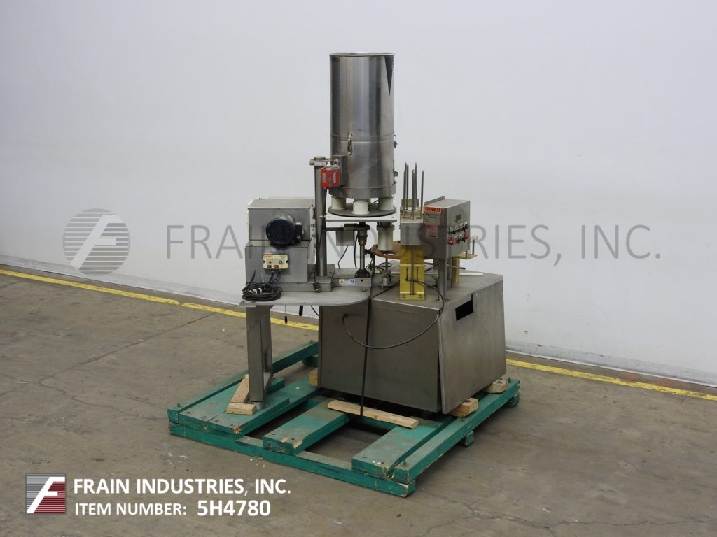 Back to All EquipmentGold Cup, Model LCF-7, automatic, stainless steel intermittent motion, large cup, rotary cup filler and heat sealer. rated from 6 to 25 cups per minute – depending on materials, application, environment and machine configuration. Fill range: Fill range: 1/2 oz to 16 oz. Cup size up to: 5" Dia x 7-3/4" High, with proper change parts. Equipped with 21" OD rotary turn table with (6) cup pockets, screw cup denester, Spee Dee volumetric filler, pre-cut foil lid magazine with pic n place, pneumatic heat sealing head and sweep arm reject station. A/B controller with start, stop, jog, fill, vacuum, and heat, on / off switches and e-stop. Mounted on stainless steel base frame with casters.