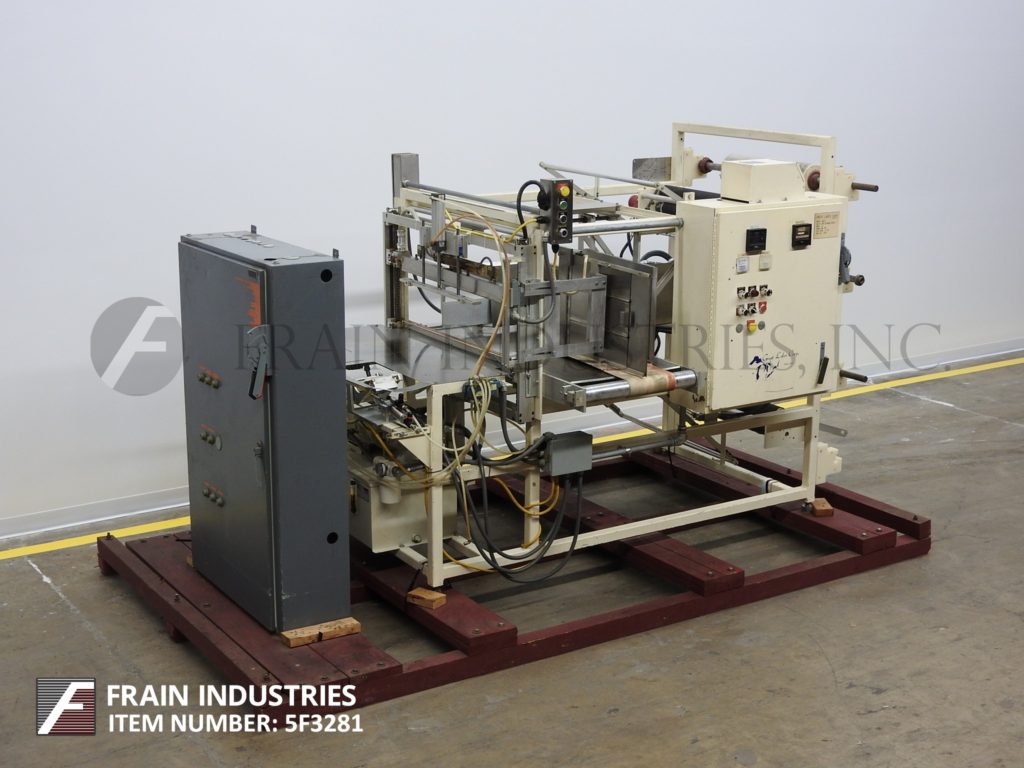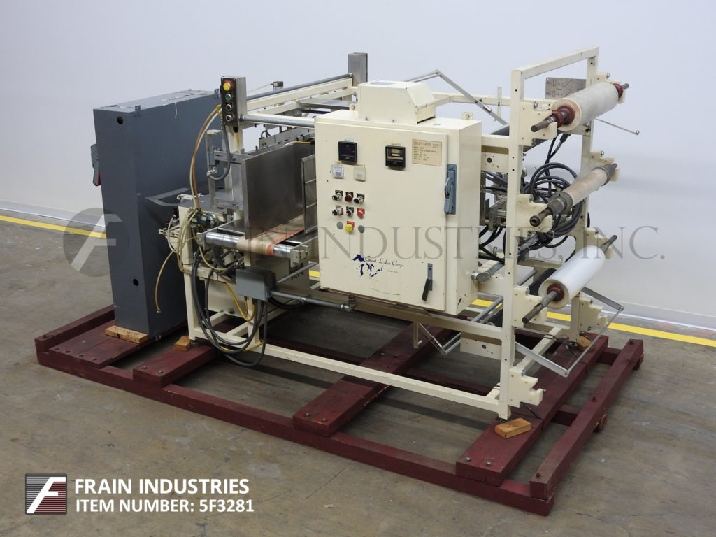 Back to All EquipmentGreat Lakes, Model 16537, automatic right angle shrink bundler. Rated from 2 to 20 bundles per minute – depending materials, application and operator dexterity. Package size range: up to 37" in Width x 20" in length x 16" in Height. Equipped with a 9½" wide x 26" long right angle infeed conveyor, 11" long x 12" high pusher bar, 38" wide upper and lower powered film rollers, 38" wide seal jaws with 16" of vertical travel and pneumatic end tack sealers. Includes controls for ribbon temp, tack temp and hydraulic on / off. Mounted on heavy duty base frame with a 36" in feed and discharge height.