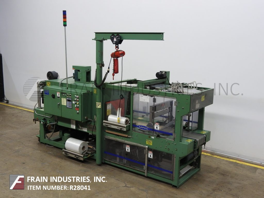 Back to All EquipmentArpac, Model 55GI-20CX, Inline, continuous motion, shrink bundler. Rated from 10 to 55 bundles per minute – depending on materials, application and machine configuration. Equipped with 13" wide x 36" long in feed conveyor, (2) 21" wide film roll holders with film splicing stations, film hoist, 21" wide walking beam seal jaws with 11" vertical travel and 13" wide x 26" long transfer conveyor to shrink tunnel. 70" long single zone shrink tunnel has 21” wide x 16" high total aperture, 90" long x 20½" wide product conveyor, cooling fan and roller side compression on discharge. Control panel with AB controller, touch pad controls with readout, start / stop / e-stop / manual seal push button controls and digital temperature controls for seal bar and tunnel. Mounted on heavy duty base frame.