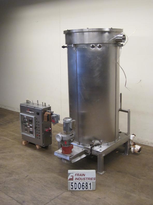 Back to All EquipmentAtmospheric continuous scrape surface heat exchanger is constructed of stainless steel with a sanitary design. Unit can concentrate 4000 pounds of caramel syrup per hour with a heat transfer area of approximately 150 sq ft. The tubular sanitary design of the evaporator allows for high working pressures in both jackets allowing for more production in less time. Widely used for syrups, caramel, cereal coatings, candies, salad dressings and sauces. Jacket pressure rating: 120 psi. National Board: 138989
