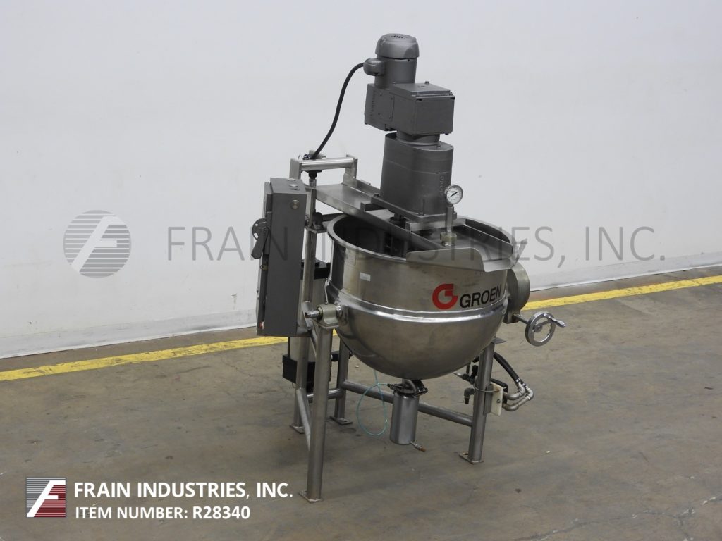 Back to All EquipmentGroen, 40 gallon, 316 stainless steel jacketed kettle. Vessel Dimensions: 28" diameter x 21" deep with a 10" straight wall. Equipped with a tilt out bridge mounted, variable speed scrape agitator and Christmas tree agitator powered by a single 1½ Hp drive with a variable speed gear box, temperature probe and 2½" OD / 2"ID tri-clamp style discharge with pneumatic flush mount valve and 12" ground clearance. Mounted on (3) tubular leg frame with manual kettle tilting discharge.