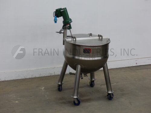 Back to All EquipmentGroen Model DHT/1-40, stainless steel, 40 gallon, gas heated, 1/2 steam jacketed mixing kettle with number of gallons of product per hour – depending on materials and application. Vessel dimensions: 26" ID x 24" Deep with bridge mounted sweep agitator and secondary x-mas tree mixer. Dish bottom has 3" OD / 2-1/2" ID side bottom discharge with 22" ground clearance. Controls panel has on / off heating switch, e-stop with temperature controller and pressure gauge. Mounted on "U" style stainless steel frame with (4) leveling legs. National Board Number # 96439