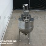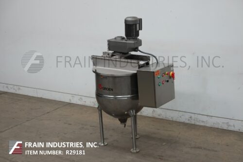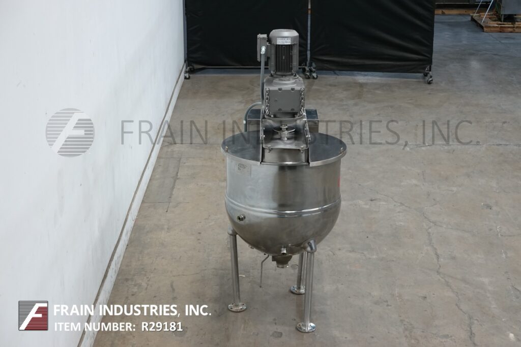 Back to All EquipmentGroen, 60 gallon, 304 stainless steel jacketed kettle. Vessel Dimensions: 30" diameter x 27" deep with a 14" straight wall. Equipped with a bridge mounted scrape agitator powered by a single 3 Hp drive, (2) fixed baffles and 3½" OD / 3"ID tri-clamp style discharge with ball valve and 13" ground clearance. Mounted on (3) tubular leg frame.