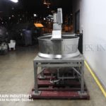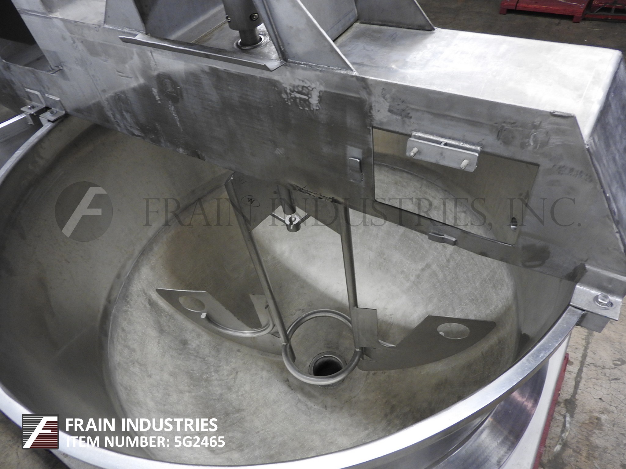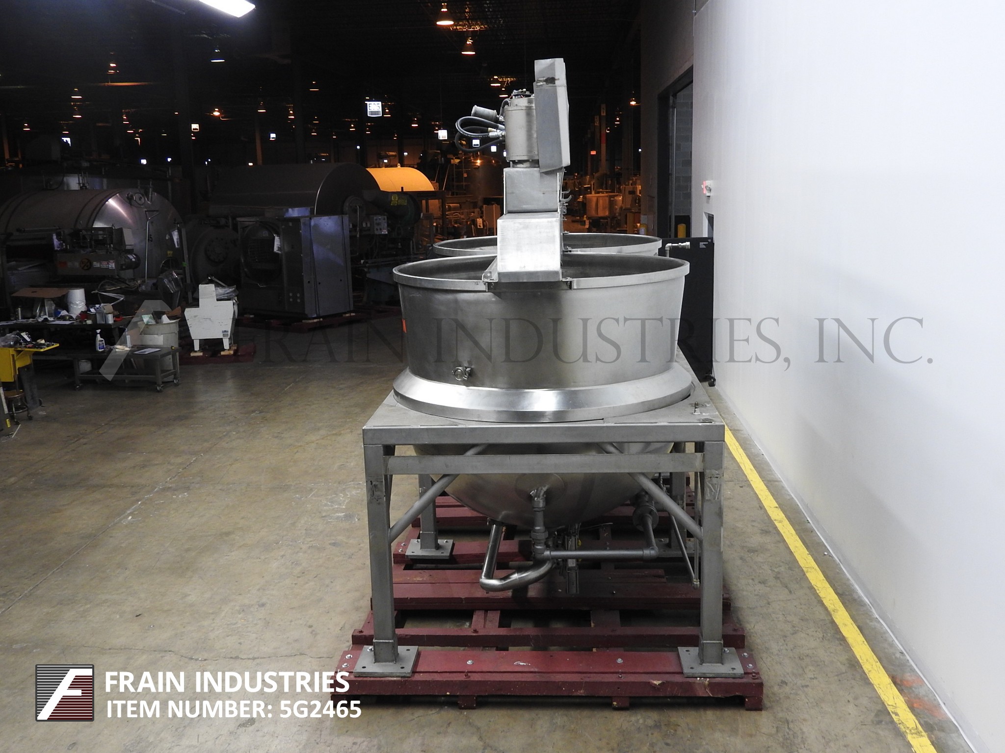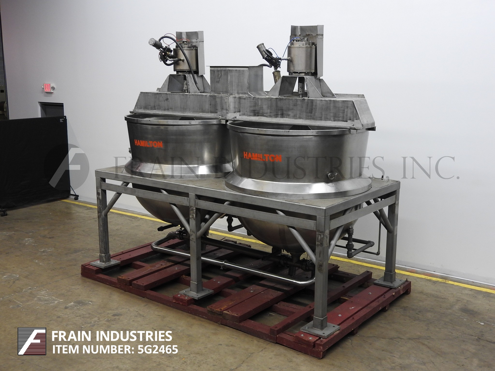 Back to All EquipmentHamilton, Dual 600 gallon, 304 stainless steel jacketed kettle. Vessel dimensions: 65" diameter; 26" straight wall. Jacket rated 110PSI @ 340°F. Equipped with oscillating paddle agitation powered by hydaulic drives, (1) 2½"OD / 1¾"ID tri-clamp style access fitting on straight wall, (4) 2" threaded jacket ports, 11"OD (6"ID) eight bolt flange center bottom discharge. Mounted on a stainless steel base.