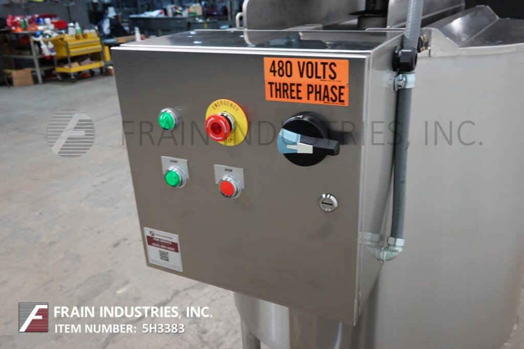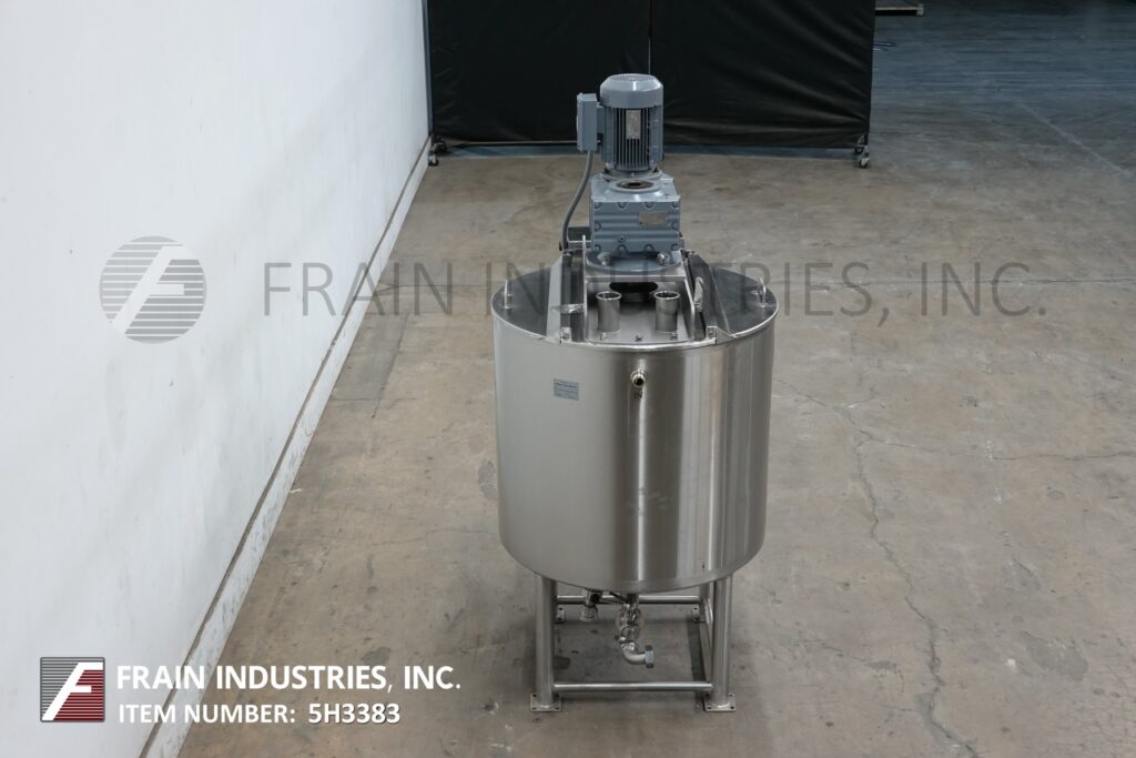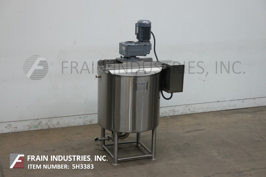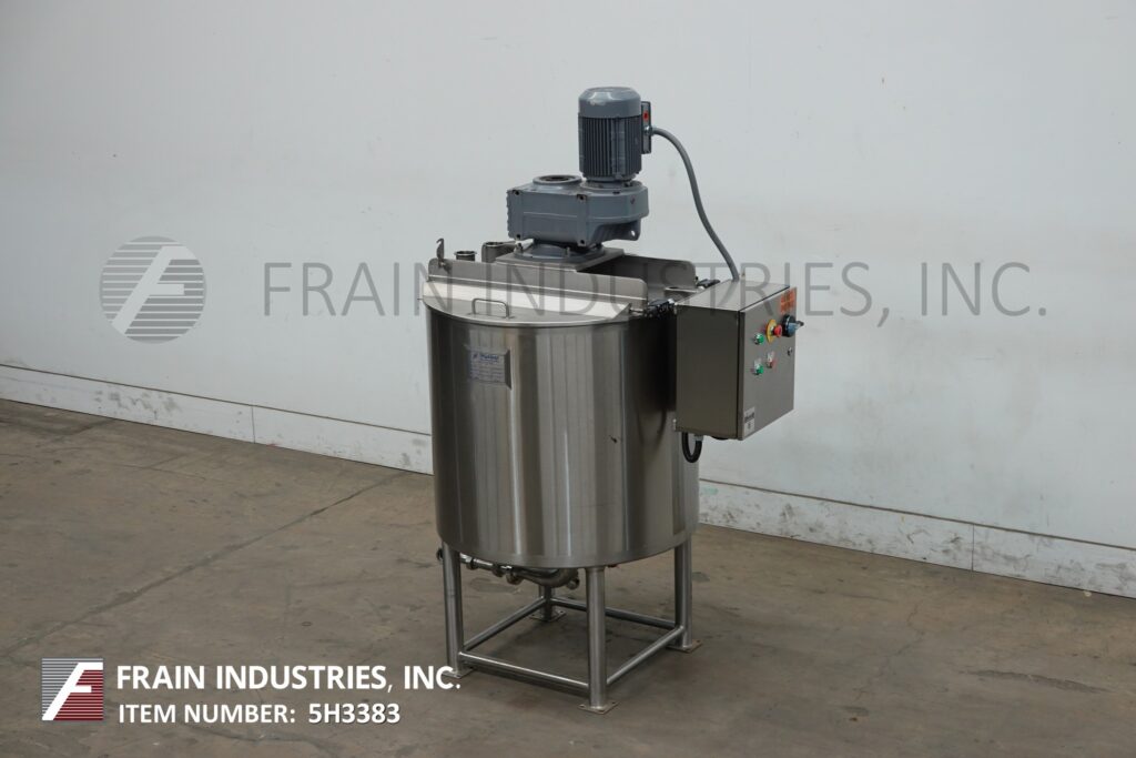 Back to All EquipmentHighland, 100 gallon, 316 stainless steel full jacketed mixing tank. Vessel Dimensions: 32″ diameter x 32″ deep. Equipped with a bridge mounted side and bottom scrape surface agitator powered by 3 Hp drive, flush mounted sensor and 3″ OD / 2½”ID center bottom discharge with15″ ground clearance. Mounted on (4) stainless steel tubular legs.