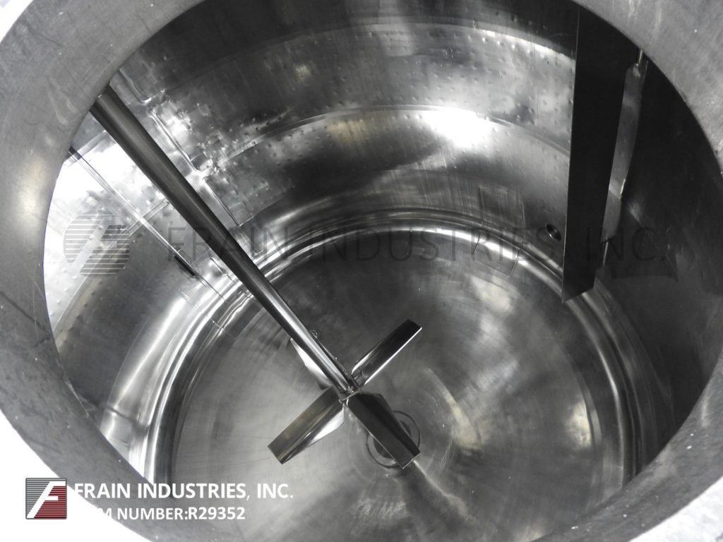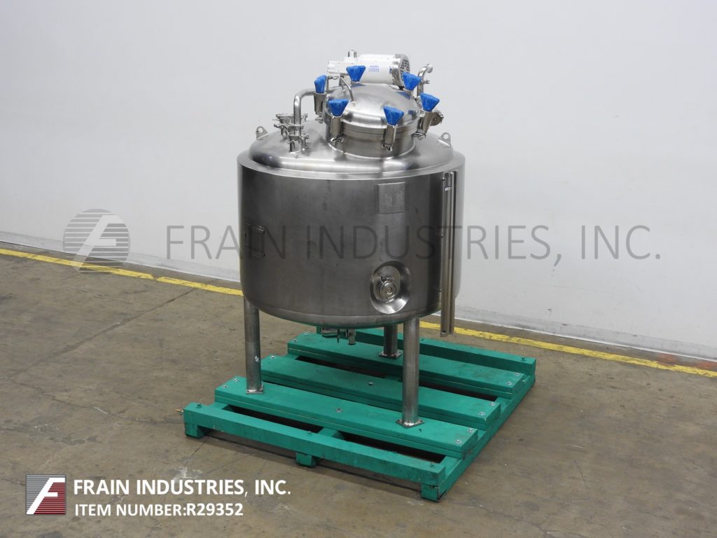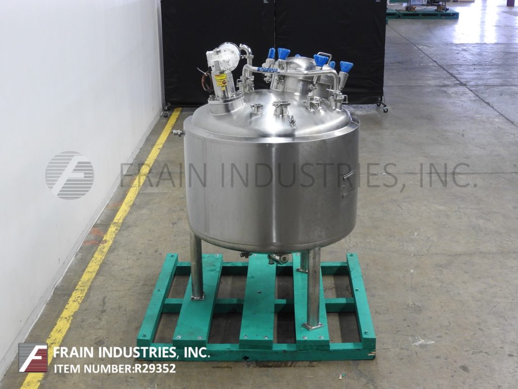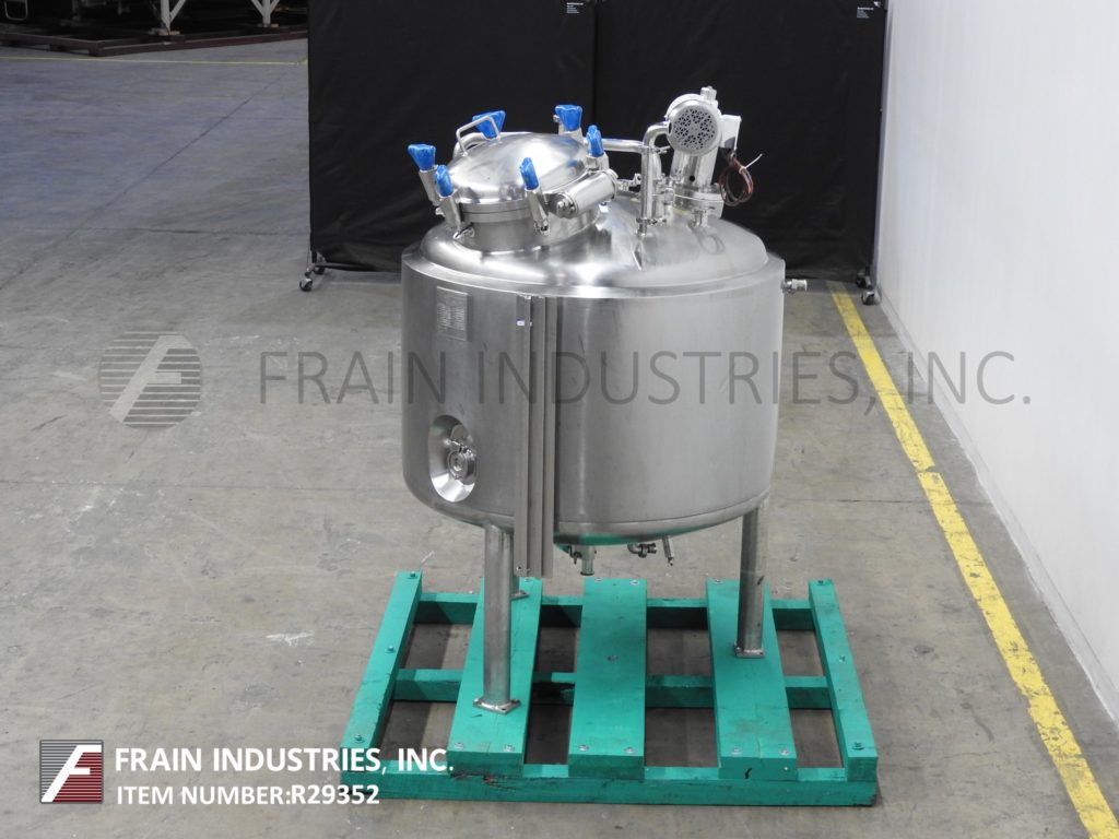 Back to All EquipmentHolloway America, 850 Liter, 316L stainless steel jacketed process tank. Vessel dimensions: 45" ID x 36" deep with 32" straight wall. Equipped with an 18" diameter bolt down manway, (2) CIP spray ball supplied by a 2"OD / 1½"ID Tri-Clamp fitting, (1) thermowells, ½ Hp top mounted dual prop agitator and 2" OD / 1½" ID tri-clamp style bottom center discharge with 19" ground clearance. Mounted on (3) leg stainless steel frame.