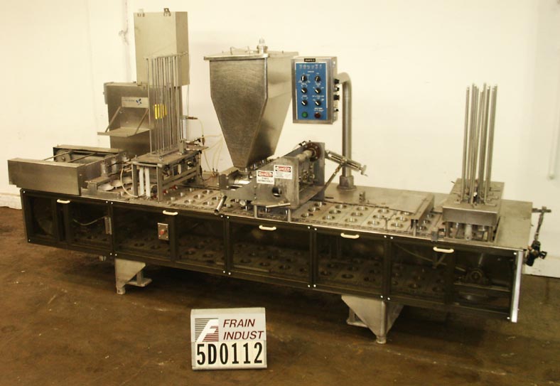 Back to All EquipmentAutomatic 1 by 3 in-line cup filler. Size range: up to 5" in Diameter; up to 7" in Height. Equipped with denest station, three 32 ounce pistons with rotary valves, over lid station and discharge. Speed dependant on materials and application.