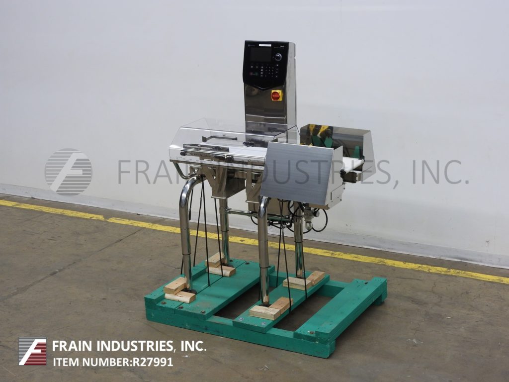 Back to All EquipmentIshida, Model DACS-GN-S015-SS-1, automatic, (3) zone, 304 stainless steel checkweigher. Rated up to 300 feet per minute with number of product – depending on materials and application. Load cell: 14" in Length; 9.5" in Width. Weight range: 6 to 1,500 grams with Accuracy: +/- 0.1 grams with accuracies dependant on materials, application, machine configuration and environment being run in. Equipped with 13.8" long x 9.5" wide neoprene in feed conveyor, stainless steel guide rails, 13.8" long x 9.5" wide neoprene weighing conveyor, 17.7" long x 9.5" wide neoprene discharge conveyor with dual air blast rejects ( one over / one under). Control panel with touch pad operator interface has 7" full color LCD display with 300 "preset" product programs, SUSB memory stick with X-bar charts and histogram and RS232 serial output of raw weight data. Mounted on (4) height adjustable legs.