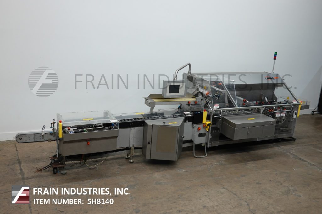 Back to Search ResultsIWKA Model SC6, Automatic, horizontal, continous motion, hot melt glue cartoner rated from 50 to 300 cartons per minute depending on materials and application. Package size range: 20mm to125mm in Length; 15mm to 110mm" in Width; 50mm to 85mm in height. Equipped with 64" long x 3" wide product in feed conveyor with worm screw indexing to 163" long fixed bucket product conveyor, with 3" long x 2" wide x 9" deep product buckets, 48" long (3) belt automatic blank carton magazine, (2) head rotary pick n place. and has (2) chains fixed set on 3" centers, automatic barrel cam product loader, Nordson hot melt glue system, Seko guages and 32" long x 2-1/2" wide discharge compression belts. Control panel has IWKA controller with swing arm touch pad controls and panel view with e-stop push buttons and statis light bar. Mounted on heavy duty frame with interlock safety guarding, casters and leveling legs.