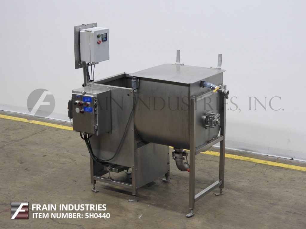 Back to All EquipmentAutomated Food Systems, 5 ft³, 304 stainless steel, paddle mixer with number of product per hour – depending on materials, application and machine configuration. Inner mixing chamber dimensions: 24" in Length; 24" in Width; 28" in Depth. Equipped with flip up cover, 1½" OD mixing shaft with (4) wire beater paddles, (2) 1½" OD charge ports, 3½"OD / 3" ID Tri-clamp style center bottom discharge with butterfly valve and 11" floor clearence. Powered by a 5 Hp. Control panel with an AB controller, push button start / stop and timer indicator. Mounted on a stainless steel frame base with leveling legs.