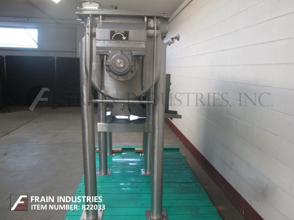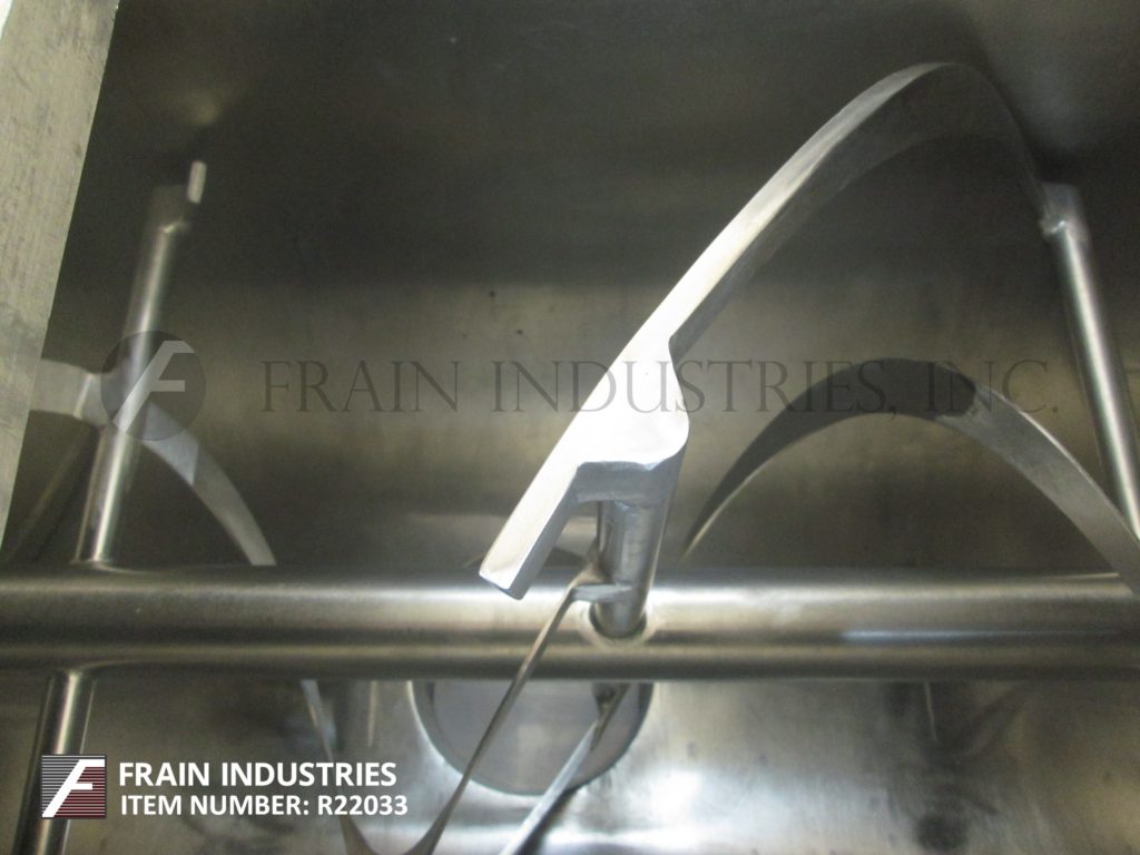 Back to All Equipment304 S/S Double ribbon blender with 17 cu ft working capacity (19.5 cu ft full capacity). Chamber dimensions: 52" in Length; 24" in Width; 29" in Depth. Equipped with: flip top cover, 2" double ribbon shaft and center bottom 8" discharge with 42" floor clearance.