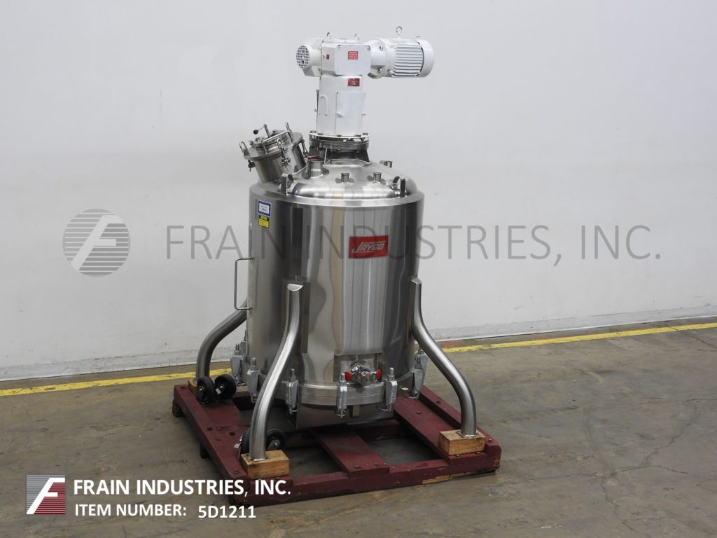 Back to All EquipmentJaygo Model APF, (Agitation Pressure Filter), 500 liter, 316L stainless steel, insulated, agitated, self contained, pressure / vacuum filtration and drying system. Internal pressure rated with amount of product per hour – depending on materials and application. Vessel dimensions: 55" OD dome top, 42" straight wall, with top mounted 5 Hp motor drive supporting bottom sweep agitation, (1) 7" OD / 4" ID flanged top port has and (1) 12" OD flip-up cover, (1) 7" OD / 4" ID flanged sight port, 2" OD / 1½" ID Tri-Clamp inlet and 3" OD / 2½" ID Tri-Clamp side bottom sanitary discharge with 16" floor clearence. Flanged removable bolt down, dish bottom and is fork lift removable, for ease of maintenance and installation of bottom filter cloth. Mounted on (4) stainless steel legs with locking casters.