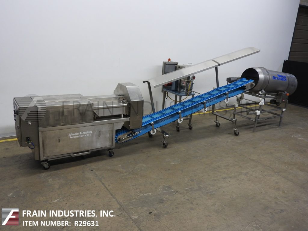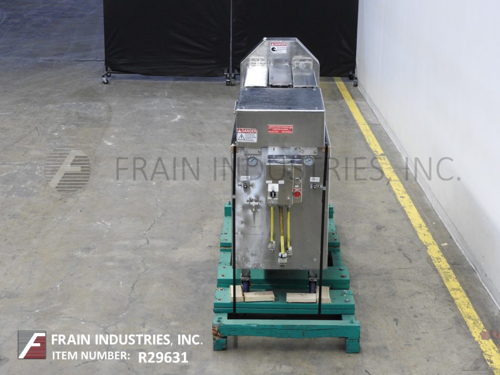 Back to All EquipmentJohnson Industries Model CJ-7200, Stainless steel, cheese loaf shredder and blender rated up to 7,200 lbs of product per hour – depending on materials and application. Loave size: 5lb, 6lb, and 10 lb at (4) loaves per cycle; 20 lb loaves at (2) loaves per cycle. Equipped with side by side 28" long x 4-1/2" wide x 7-1/2" deep product compartments with slide open safety covers and (2) pneumatic product pushers, with 31" OD (4) blade cross cut shredding disc with safety cover. Control panel has right and left cylinder control dials (2) pressure gauges one for each side with control and product demand switch and start / stop pusher controls each side of product troughs. Mounted on a stainless steel base frame with casters.