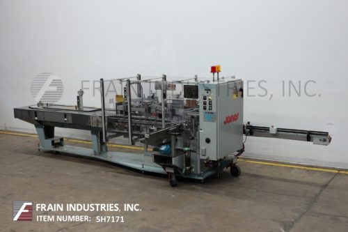 Back to All EquipmentJones, Model CMV5, Semi automatic, continuous motion, vertical, tuck cartoner, rated from 40 to 120 cartons per minute – depending on materials and application and operator dexterity. Carton size range: 1" to 4¼" in Length x ¾" to 4½" in Width x 2½" to 9" in Depth. Equipped with (3) chains adjustable set on 5" centers, with 29" long blank carton magazine with vibratory feeder and carton pusher, reciprocating single head suction cup pick-n-place, 96" long load area each side with major and minor flap closers and tuckers with 96" long x 4" wide discharge conveyor belt. Control panel has PLS controller with control power and carton feed on / off switches, start, stop push buttons with e-stop. Mounted on heavy duty frame with safety guarding and statis light.