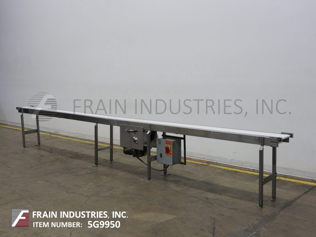 Back to All EquipmentKeenline, stainless steel conveyor. Equipped with an 8" wide x 230" long Neoprene belt with an infeed / discharge height of 35", pneumatic stop gate on discharge end, ½ hp drive and mounted on (6) legs.