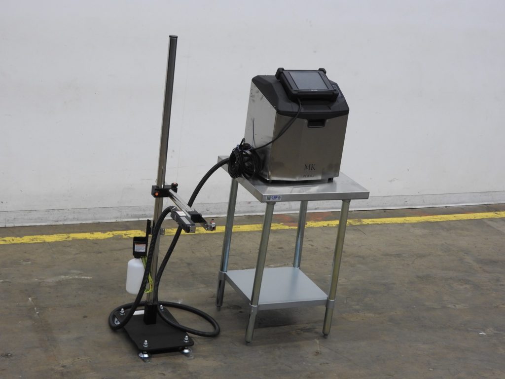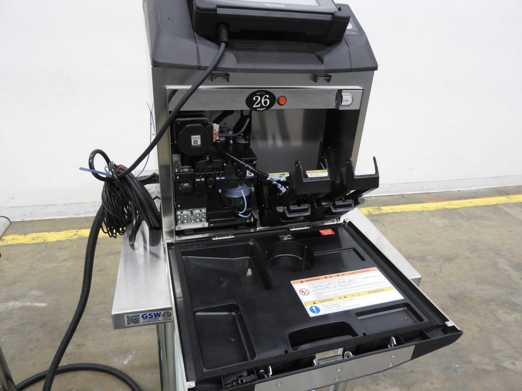 Back to All EquipmentKeyence, Model MK-U6000, ink jet coder with auto-shower self cleaning print head. Capable of running 1 to 6 lines at speed up to 2525 characters at 5-dot 1 line printing and 1-dot character spacing, with number of prints per minute – depending on materials and application. Character types alphbetic, numbers, logotypes and symbols with (vertical) character heights of 1mm to 12mm, 0.04" to 0.47" and dot configurations of 5, 7, 10, 12, 14, 16, 24, 32 dot capable, with fonts original, mincho and gothic with print registration of 500 settings Standard black MK-10 ink and print head is capable of printing in all directions with distances of 15mm, 0.59" (24 dots or less) 20mm, 0.79" (25 dots or more) and 35mm or 1.38". Has auto calender, expiration date, auto counter with 2 to 36 number system counter, automatic operation with character direction settings of 90, 180, 360 degrees. MK-P4 touch panel console, with PC software, MK-HB2 (MK builder2) and USB memory device, with automatic nozzle cleaning, ink draining, internal cleaning, error maintenance display and history. RS-232C ethernet interface, stainless steel housing and ambient operating temperature of 0 to 45 Deg C or 32 to 95 Deg F. Table or cart mounted with print head stand.