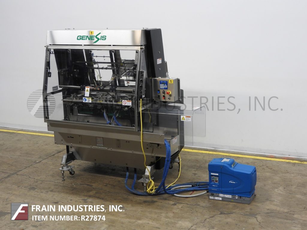Back to All EquipmentKliklock Model Genesis GF, automatic, stainless steel, dual head, hot melt glue tray former. Rated from 30 to 60 strokes per minute each head with number of trays – depending on materials and application. Tray size range: 5" to 16¾" in Length; 4" to 10" in Width; 7/8" to 4" in Depth with proper change parts. Equipped with dual 24" long blank tray magazines, suction cup reciprocating pic n place, dual head ram with minor flap and major flap folding plows, Lexon hooded seal area with lift-up access door, 72" long lugged chain tray transfer conveyor set on 20" centers thru machine. Nordoson Problue hot melt glue unit. Control panel has jog, manual, run, forward, reverse, vacuum on / off switch and start, jog, stop and e-stop push button controls. Mounted on heavy duty stainless steel base frame with casters and height adjustable leveling legs.
