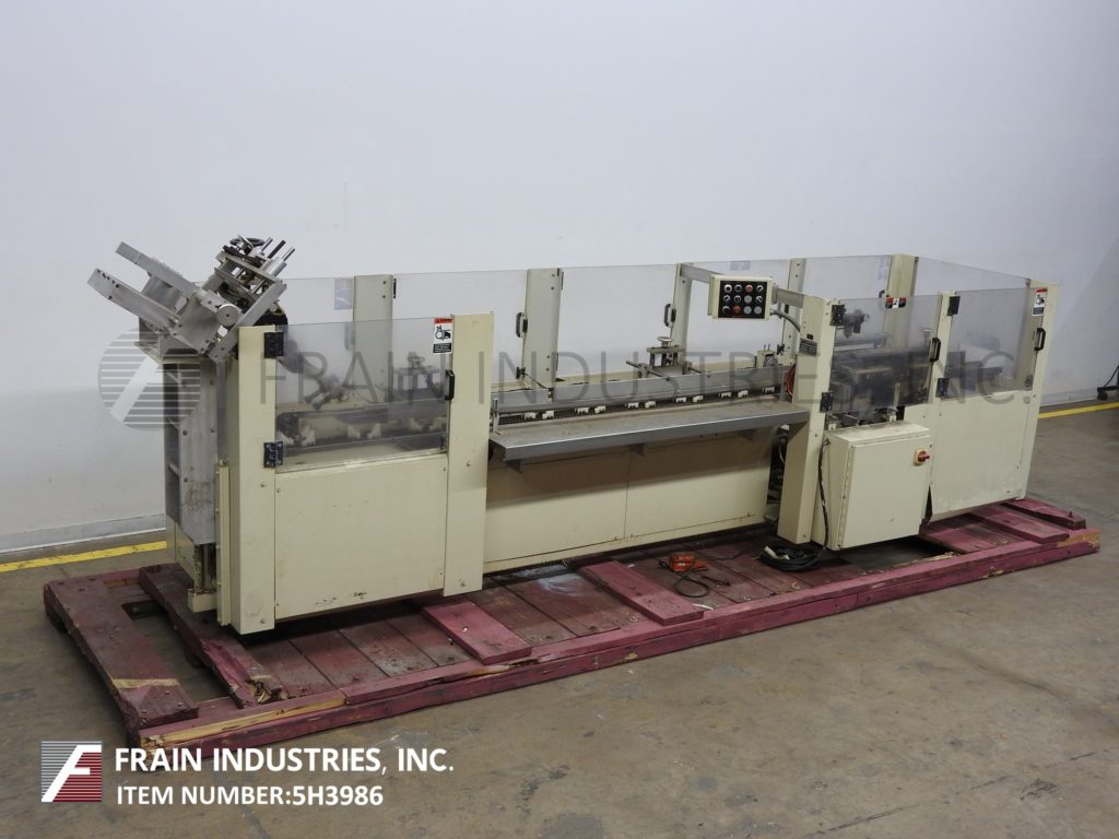 Back to All EquipmentKodiak Model 901-120, Semi automatic, horizontal, continous motion, hot melt glue cartoner rated from 20 to 120 cartons per minute – depending on materials, application and operator dexterity. Carton size range per application. Equppied with (4) chains adjustable set on 12" centers with 2-1/4" wide x 2-1/4" high lugs, 24" long blank carton magazine, recpicating vacuum suction cup pick n place, 70" long product operator load area, Nordson (2) gun hot melt glue system with major and minor flap closers. Control panel has A/B vari-speed controller, with vacuum and glue on / off, run jog and speed control switches, with start, stop and-e-stop push buttons. Mounted on heavy duty base frame with safety door guarding and foot pedal jog.