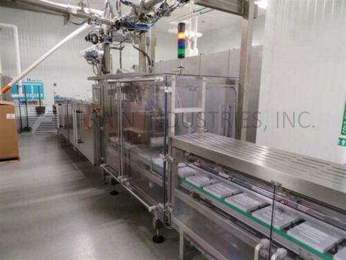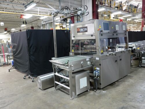 Back to All EquipmentKreuter Model Chocomat, 48" wide, stainless steel, chocolate enrober and product dripping zone with pounds of product per hour – depending on materials and application. Equipped 48" wide total x 204" long wire mesh product conveyor belt thru enrober and dripping zone, with 40" in feed and discharge height. 108" long enrobing section with Waukesha pump and piping system fitted with scraper to prevent cloggage to the 48" wide top mounted coating head and has 48" wide wire mesh product hold down belt and flip-up plastic safety doors. 3-way valve for different coating possibilities complete coating, only bottom and only top coating. Water circulation is controlled by digital controller and temperatures are not to exceed 40 Deg C. and has inlet and outlet dry heaters and bottom stripping device and has 96" long dripping zone section after the enrober with blowers and side flip-up sight doors, with pressure pipe circulation, feed and vibration systems and scavenging roller with scraper to remove excess chocolate. Remote control panel has temperature controllers, chocolate pump, mesh belt, belt and stirer, and hold down device, return pump, scraper, blower, drive and start, stop controls. Mounted on heavy duty stainless steel base frame.