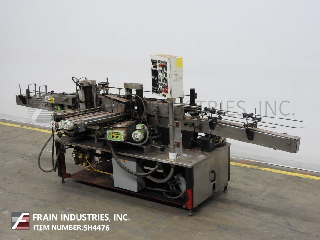 Back to All EquipmentKrones, Model Rondella, automatic, inline, wrap around glue labeler. Rated 80 to 400 container per minute – depending on materials and application. Label size range: 6½" to 17-1/8" in Length; 1/8" to 7-7/8" in Height. Container size range: 2" to 5-1/8" in Diameter; 2-3/8" minimum to depending on application for maximum in Height. Equipped with 24" long pre-cut label magazine, 164" long x 3¼" wide container conveyor with spacing wheel, (2) hot glue pod system for leading and trailing edge glue seams, wrap station and control panel. Mounted on (4) leg height adjustable frame.