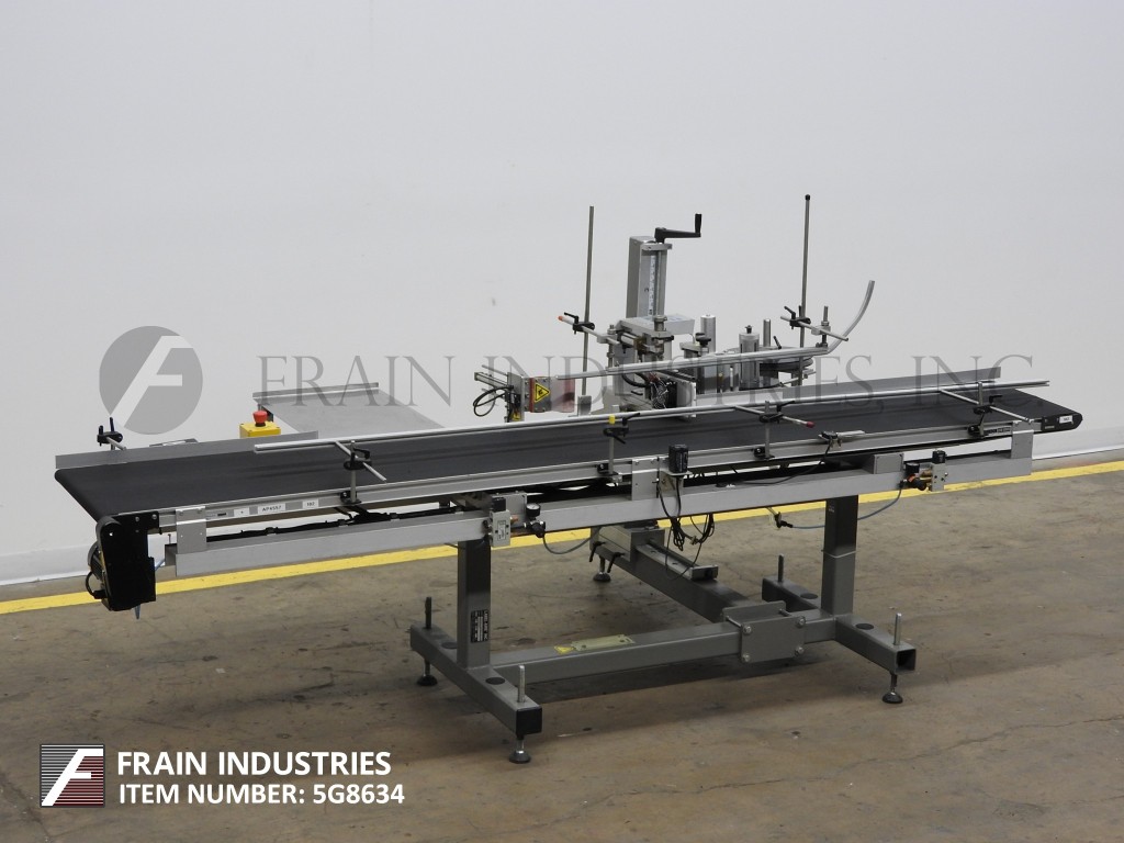 Back to All EquipmentLabel Aire, Model 3111/14-15 LH/SW Grid, pressure sensitive, around the corner spot labeler. Rated from 100 to 2000 linear inches per minute with number of product – depending on materials, application and machine configuration. Equipped with swivel mounted bracket, tamp on label head and label size range: ¾" to 12" in Length ; ¾" to 4" in Width, with proper change parts and accuracies of: ± 1/32", 12" OD label roll with a 3" core and 8" OD powered label rewind. Pneumatic 90° vacuum grid plate to tamp on front of label, and swing arm wrap around corner wipe arm to smooth out front of label. Stepper driven has touch pad controller with digital display. Mounted on 18" wide x 120" long belt conveyor with leveling legs.