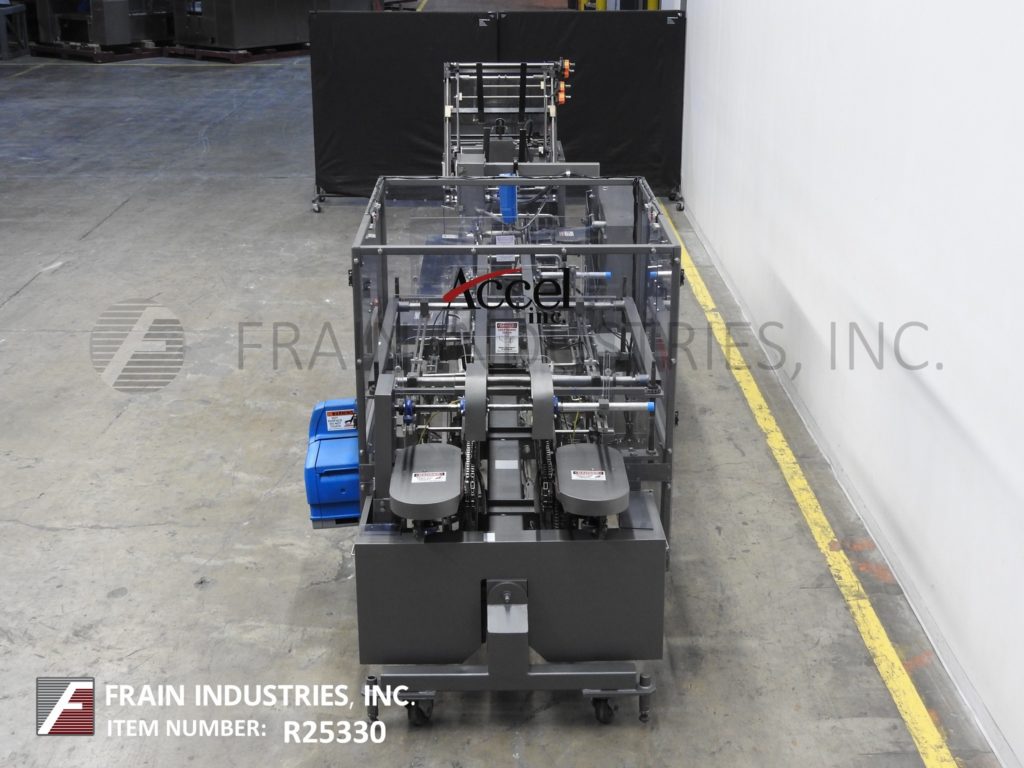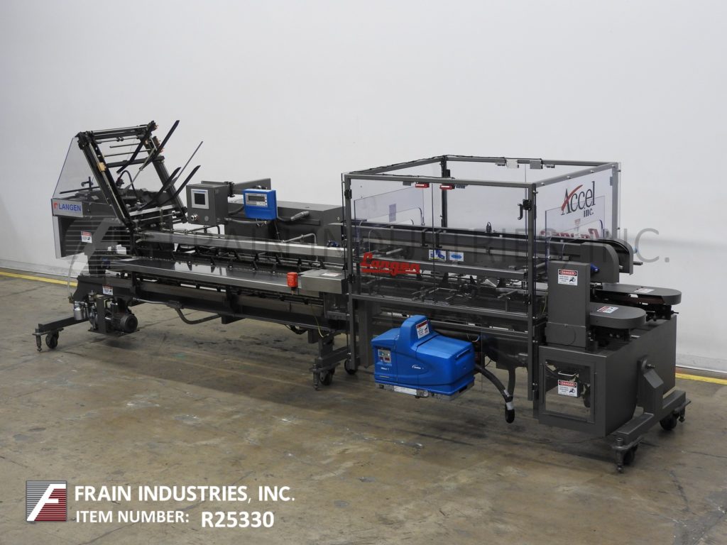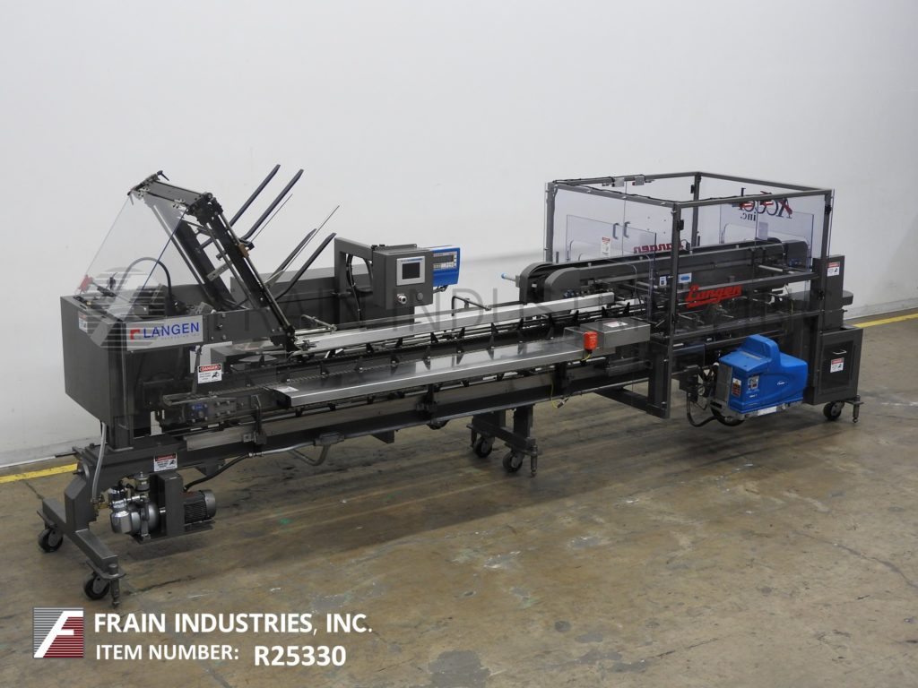 Back to All EquipmentLangen Model B1-M, semi automatic, continous motion, horizontal, hot melt glue cartoner rated from 40 to 120 cartons per minute – depending on materials and application. (4) chains adjustable set on 18" centers, with 2" long x 3" high lugs. Carton size range: 1¾" to 15¾" in Length; ½" to 6" in Width; 3¾" to 14" in Depth. Equipped with 24" long blank carton magazine, (2) head rotary vacuum pic n place, 60" long product hand load area, with top squaring system, major flap plows, minor flap closers, Nordsen (2) gun hot melt glue system, 24" long dual belt compression discharge section, vacuum system Seco gages Control panel with start / stop, jog / run, glue, carton feed and vacuum pump, on and off switches with e-stop. Mounted on base frame with height adjustable legs and casters.