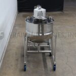 Back to All EquipmentLee, Model 100D9MT, 316 stainless steel skid mounted jacketed kettle with hot water circulation. Vessel Dimensions: 36" diameter x 28" deep with a 13" straight wall. Equipped with a Mokon DR4018AFW01 water heater, flush mount sensor, tilt out bridge mounted scrape agitator powered by a single 3 Hp drive and 3½" OD / 3"ID tri-clamp style discharge with ball valve with 28" ground clearance. Mounted on stainless steel frame with casters.