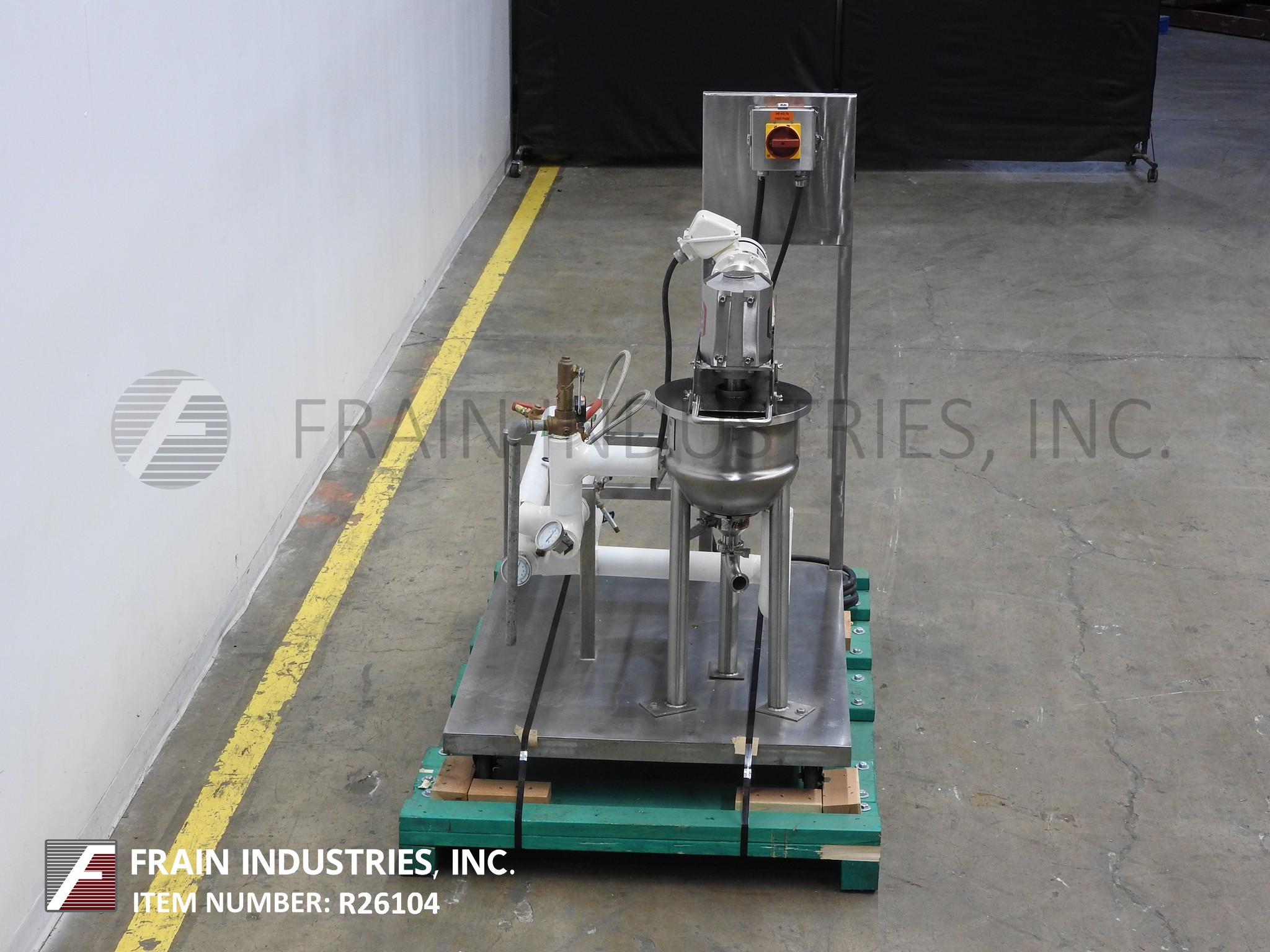 Back to All EquipmentLee Model 3D9MT, 3 gallon, 316 stainless steel, jacketed, dual motion, scrape surface mixing kettle. Vessel dimensions: 9-/12" in Diameter; 10" in Depth. Equipped with bridge mounted, tilt out dual motion scrape surface agitation, 1/2 jacketed rated at MAWP of 90 psi @ 332°F. (2) 1" OD jacket inlet/ outlets. 1-1/2" OD center bottom discharge with 12" floor clearance and mounted on (3) stainless steel legs on base platform with water and steam in / out insulated piping with pressure gauges. National Board # 4475