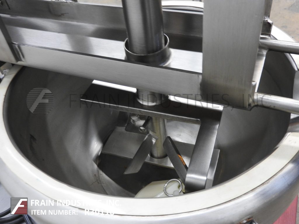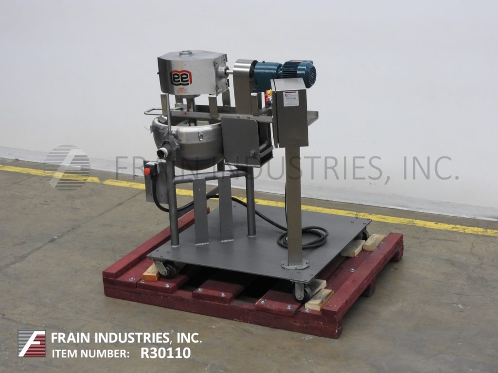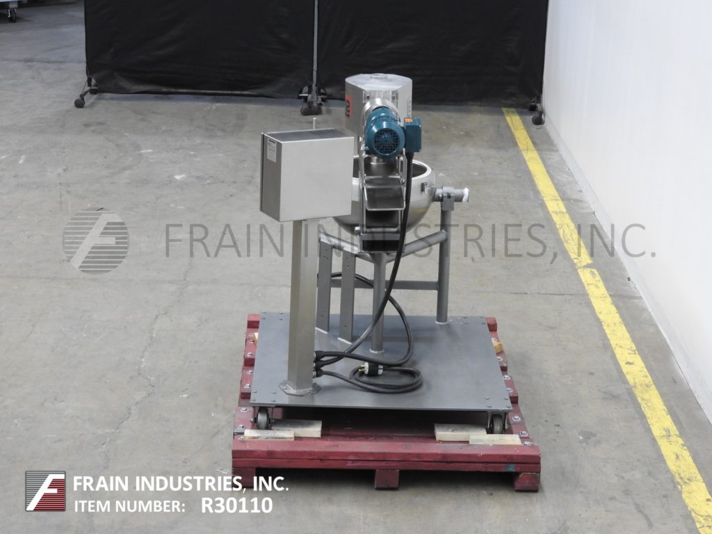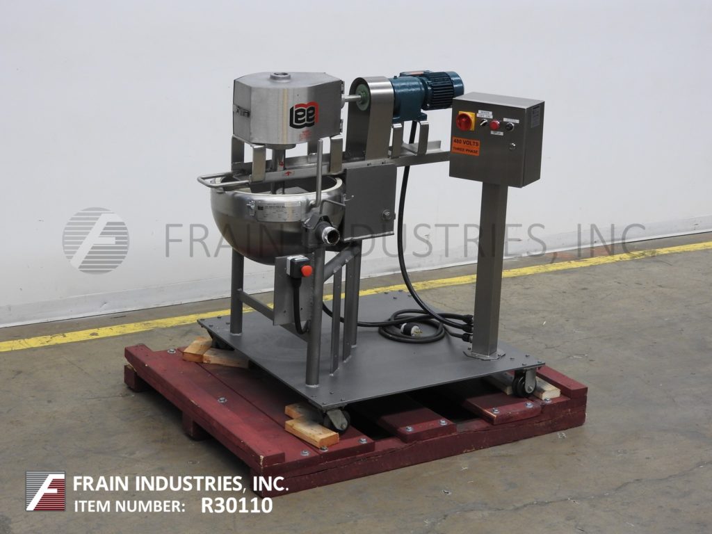Back to All EquipmentLee, Model 5CD9MT, 5 gallon, 316 stainless steel jacketed double motion kettle. Vessel Dimensions: 16" diameter x 10" deep with a 3" straight wall. Equipped with tilt out (scrape & counter rotation) agitation, ½ hp variable speed drive and manual tilt discharge with 21" ground clearance. Mounted on a 40" x 40" painted base with casters.