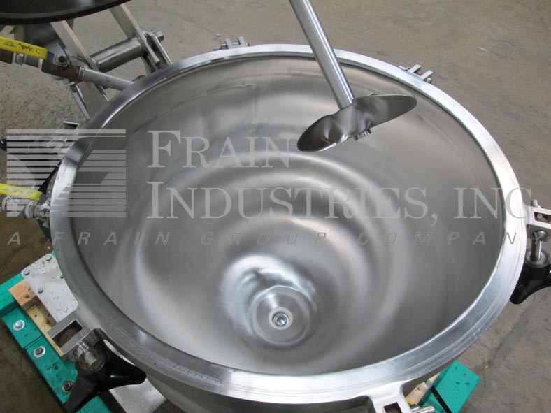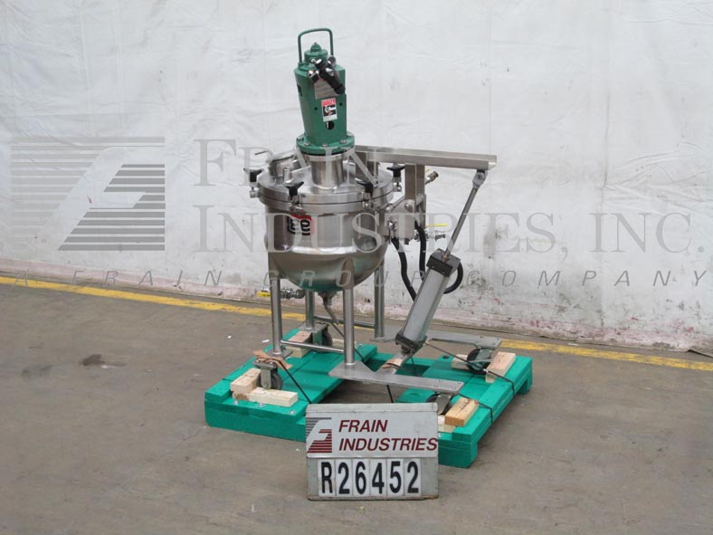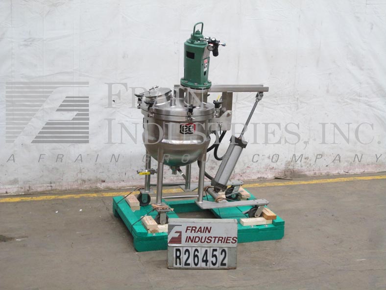 Back to All EquipmentLee, Model 20D, vacuum rated 316 stainless steel half jacketed single motion kettle. Vessel Dimensions: 22" diameter x 9" straight wall. Equipped with a pneumatic Lightnin mixer with a 7" diameter 3 blade prop. Lift out bolt down cover with (4) 2"OD/1½"ID tri-clamp fittings and (1) 8¾" diameter manway with lift off lid. (2) 1" jacket inlets. Dish bottom equipped with a ball valve with 2"OD/1½"ID tri-clamp style discharge with 15" ground clearance. Unit mounted on (4) tubular legs and common base with locking casters.