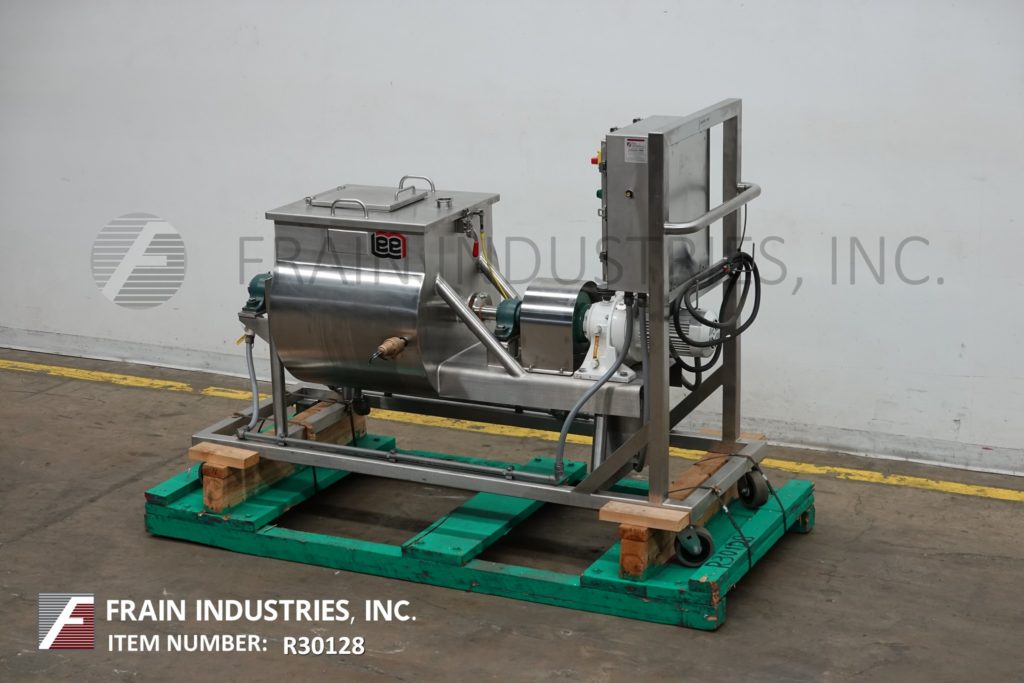Back to All EquipmentLee 25UTPR, 25 Gallon, 3.3 ft³, 316 stainless steel, jacketed, horizontal paddle mixer. Vessel dimensions: 23" in Length; 20" in Width; 24" in Depth. M.A.W.P: 100 psi @ 338° F; M.D.M.T: -20° @ 100 psi. Equipped with a clamp down cover, 2.5" OD Tri-Clover top inlet, 10" x 10" flip open port, six 5" wide x 3" high paddles on a 2" diameter shaft, 2.5" OD side bottom discharge and variable speed.