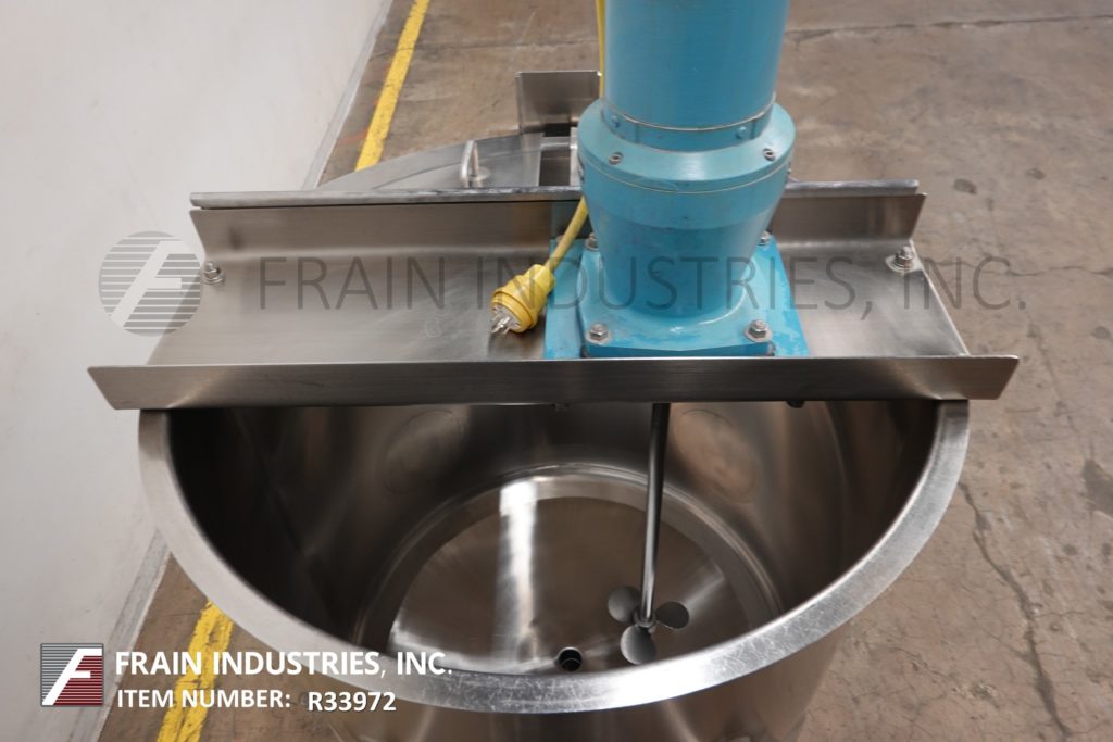 Back to All EquipmentLee, Model 100 DBT, 304 stainless steel tank. Vessel dimensions: 30" diameter x 38" deep with a 35" straight wall. Equipped with a lift off cover, bridge mounted prop agitation powered by a 3 hp drive and 2½"OD / 2"ID Tri-Clamp style discharge. Mounted on (4) stainless steel legs with casters.