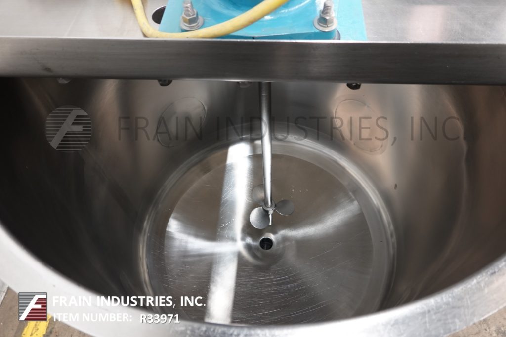 Back to All EquipmentLee, Model 100 DBT, 304 stainless steel tank. Vessel dimensions: 30" diameter x 38" deep with a 35" straight wall. Equipped with a lift off cover, bridge mounted prop agitation powered by a 3 hp drive and 2½"OD / 2"ID Tri-Clamp style discharge with butterfly valve and 10" ground clearance. Mounted on (4) stainless steel legs with casters.