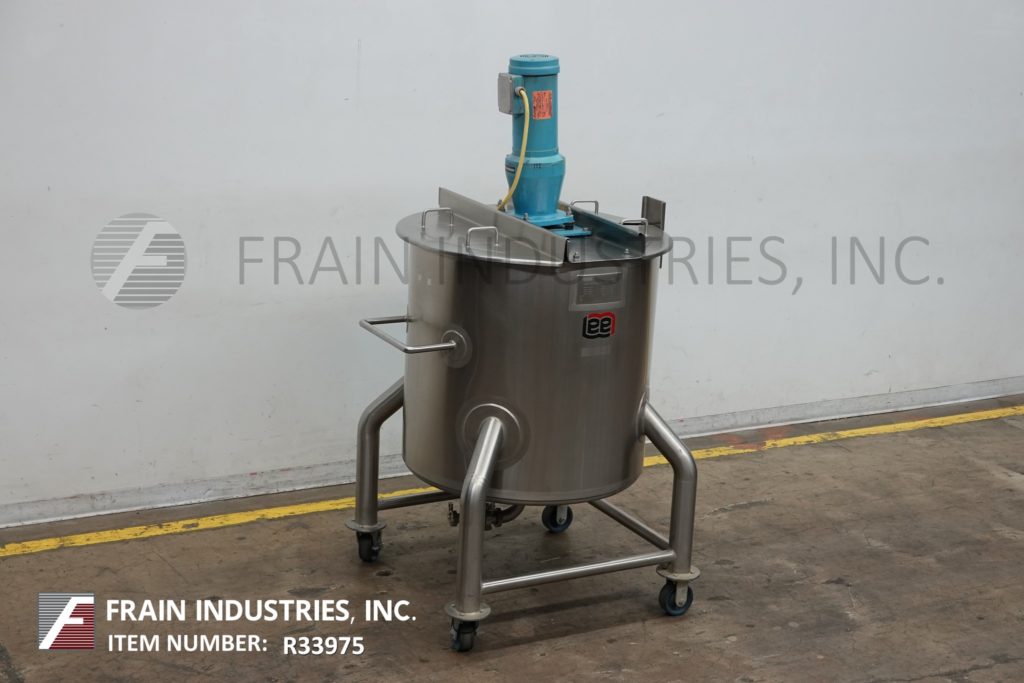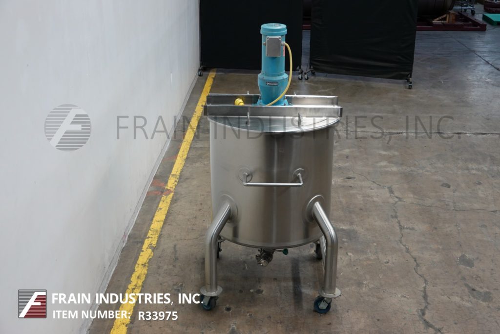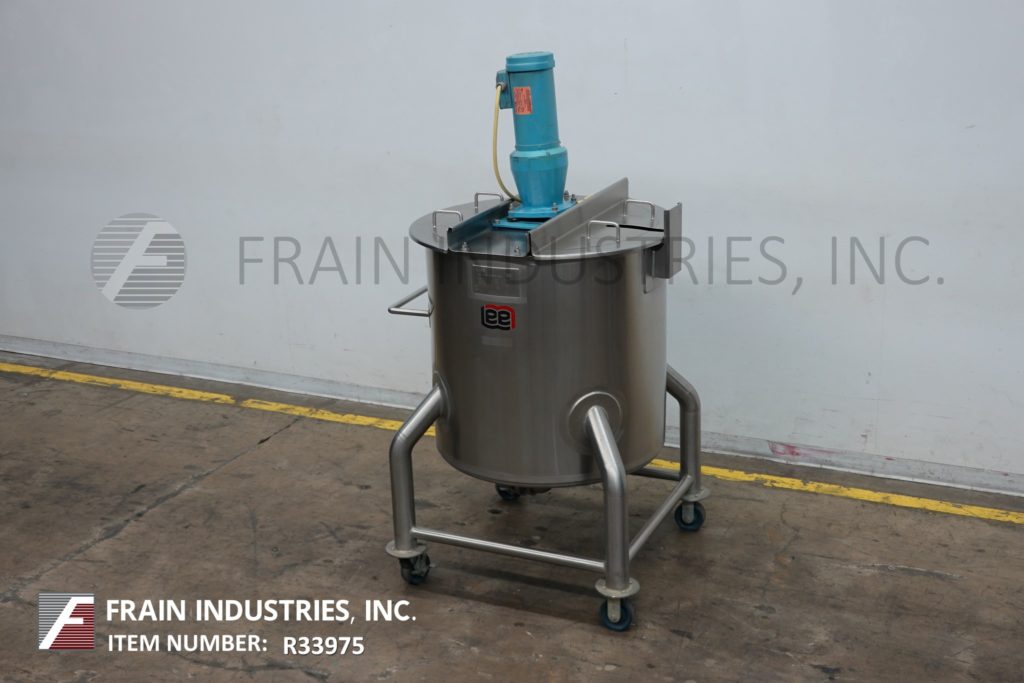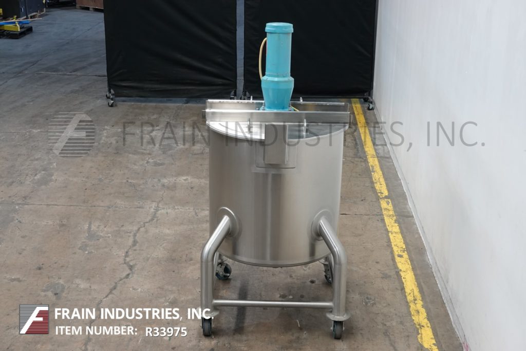 Back to All EquipmentLee, Model 150 DBT, 304 stainless steel tank. Vessel dimensions: 36" diameter x 48" deep with a 35" straight wall. Equipped with a lift off cover, bridge mounted prop agitation powered by a 3 hp drive and 2½"OD / 2"ID Tri-Clamp style discharge with butterfly valve and 10" ground clearance. Mounted on (4) stainless steel legs with casters.