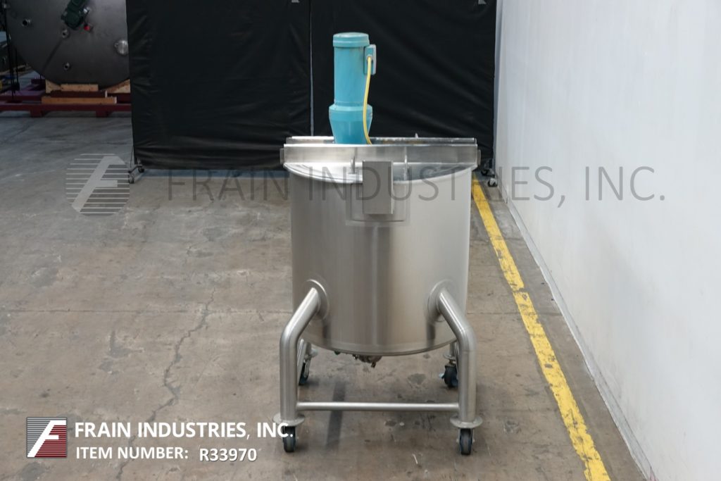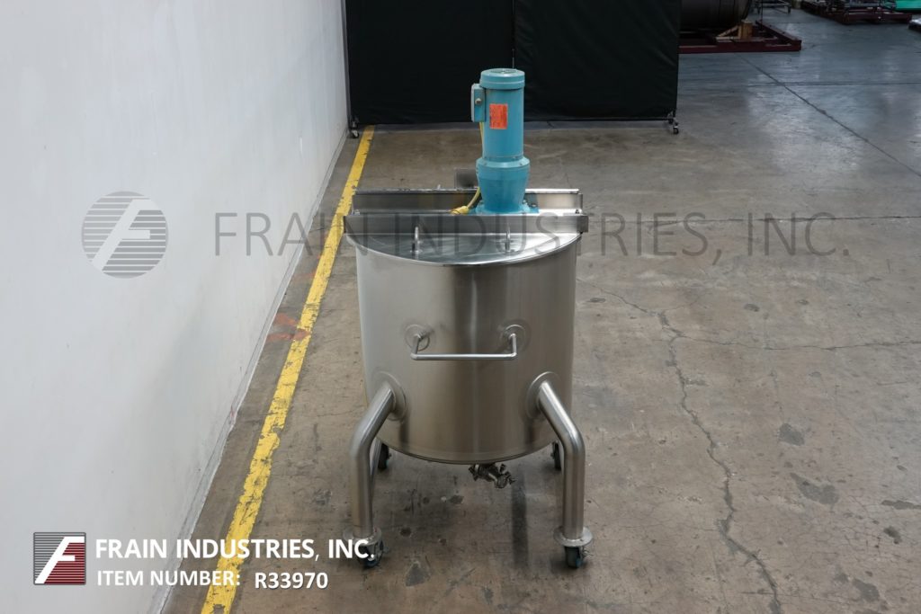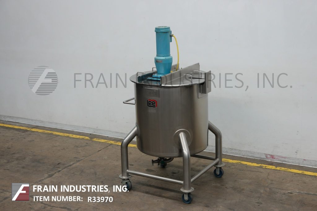 Back to All EquipmentLee, Model 150 DBT, 304 stainless steel tank. Vessel dimensions: 36" diameter x 48" deep with a 35" straight wall. Equipped with a lift off cover, bridge mounted prop agitation powered by a 3 hp drive and 2½"OD / 2"ID Tri-Clamp style discharge with butterfly valve and 10" ground clearance. Mounted on (4) stainless steel legs with casters.