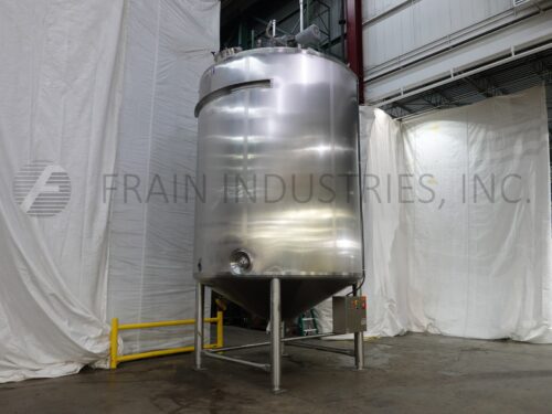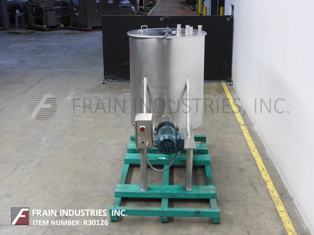 Back to All EquipmentLee, Model 300DBT, 300 gallon capacity, 316 stainless steel single wall tank. Vessel dimensions: 44" diameter x 55" deep with dish style bottom. Equipped with flip up covers and 10 Hp bottom side mounted Dixie mixer agitator. Unit mounted on (4) legs with a 3½" OD / 3" ID tri-clamp style bottom discharge with 16" ground clearance.