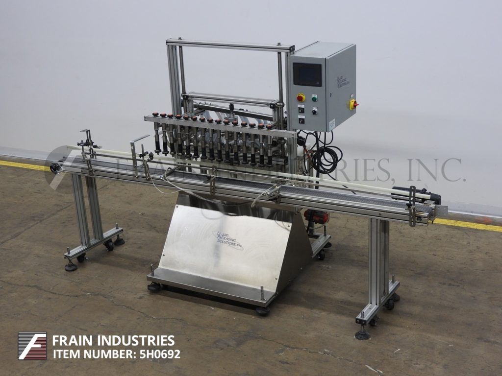 Back to All EquipmentLiquid Packaging Solutions, 15 head stainless steel, automatic, in line overflow filler with size and number of containers per minute – depending on materials and application. Equipped with 128" long x 4-1/4" wide table top container conveyor with adjustrable guide rails and pneumatic indexing. 48" long slide bar currently has 15 diving filling heads with 1/2" OD nozzles, 24" long x 18" wide x 20" high poly product feed and overflow tank with centrifugal pump. Control panel has A/B PLC with touch screen operator controls and read out, vari-speed control dials. power up, height down and e-stop controls. Mounted on stainless steel base frame with casters and height adjustable leveling legs.