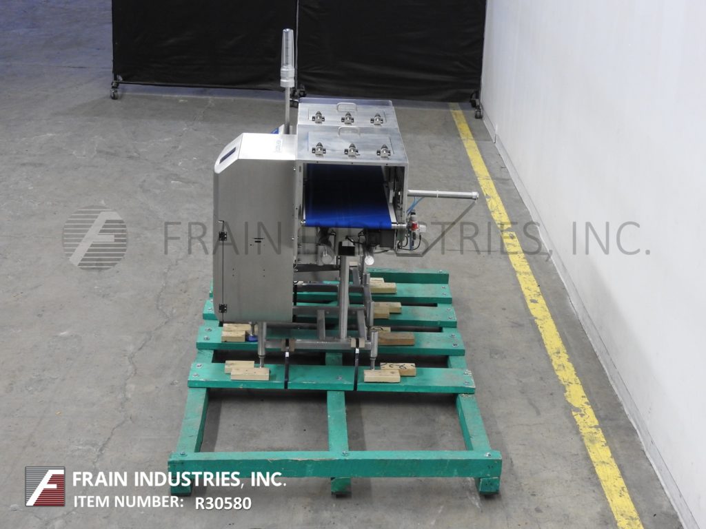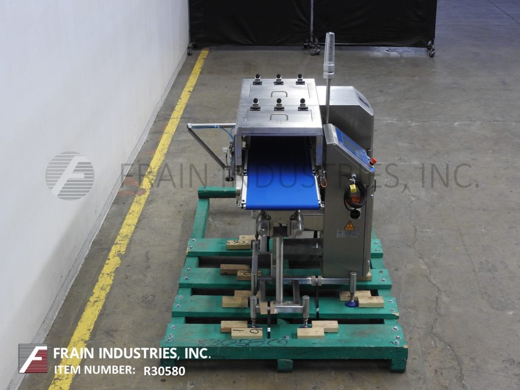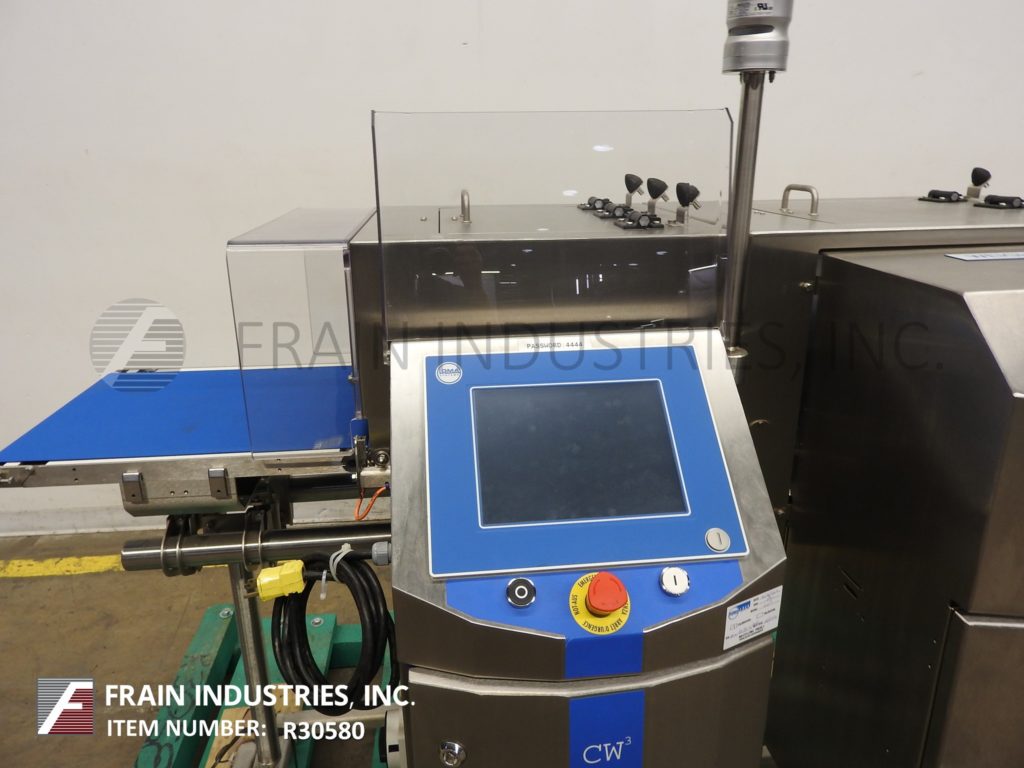 Back to All EquipmentLoma Model CW3 6000M, inline, 304 stainless steel checkweigher rated from 33 to 147 feet per minute. Weight range: 20 to 6000 grams. Accuracies +/- 0.30 gram. Operating temperatures from 0 to 40 Deg C. Equipped with 19-3/4" long x 15-3/4" wide in feed, 19-3/4" long x 15-3/4" wide load cell and 28" long x 15-3/4" wide discharge anti-static conveyors with single air ram arm reject, reject collection bin and status light bar. Control panel has touch pad controller with readout, start, stop, e-stop push buttons and data retrieval is capable via USB, Ethernet, E-Net and Tracs. Mounted on height adjustable (4) leg base frame. Speed and accuracies dependent on materials, application, machine configuration and environment being run in.