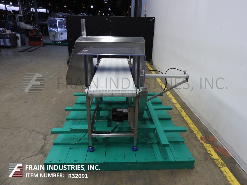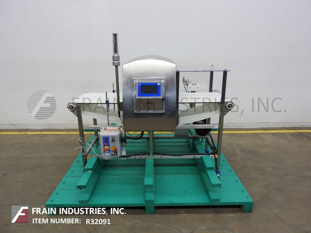 Back to All EquipmentLoma, Model IQ4 touch screen, automatic, in line, stainless steel, metal detector with number of product per minute – depending on materials and application. 304 stainless steel construction. Total Aperture: 12" in Height; 21-1/2" in Width. Working Aperture: 10-1/2" in Height; 19-1/2" in Width. Equipped with 19-1/2" wide x 72" long Intralox product conveyor belt and is 31" to 35" adjustable in feed and discharge height, with ram arm reject, 7" color touchscreen controller with user interface, start, stop, e-stop push button controls and signal tower. Sensitivities: depending on product, container and environment being run in. Temperature range: -10 to +40 Deg C, 14 to 104 Deg F. Ethernet and USB capable. Mounted on stainless steel frame with height adjustable legs.