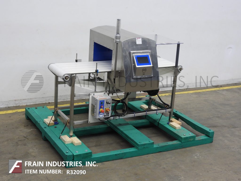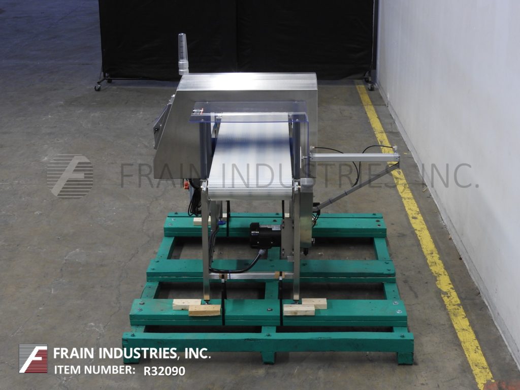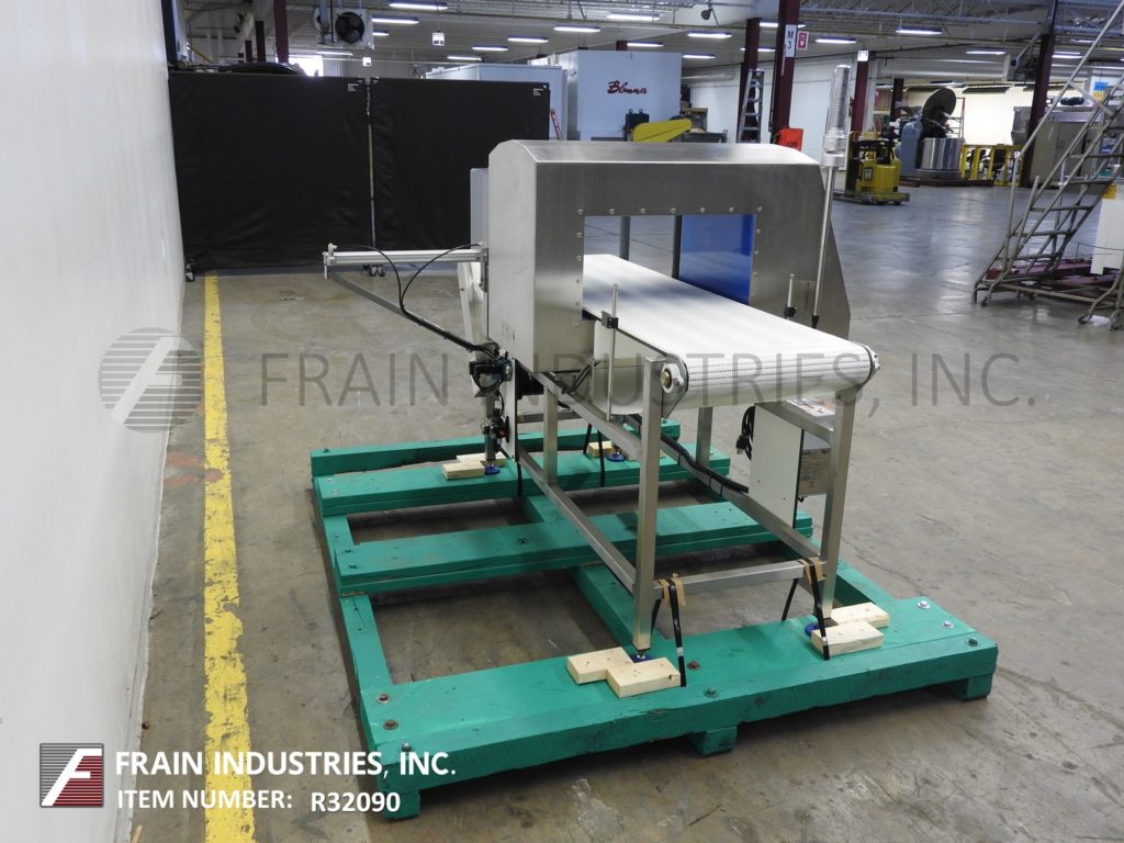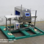 Back to All EquipmentLoma, Model IQ4 touch screen, automatic, in line, stainless steel, metal detector with number of product per minute – depending on materials and application. 304 stainless steel construction. Total Aperture: 12" in Height; 21-1/2" in Width. Working Aperture: 10-1/2" in Height; 19-1/2" in Width. Equipped with 19-1/2" wide x 70" long Intralox product conveyor belt and is 34" to 38" adjustable in feed and discharge height, with ram arm reject, 7" color touchscreen controller with user interface, start, stop, e-stop push button controls and signal tower. Sensitivities: depending on product, container and environment being run in. Temperature range: -10 to +40 Deg C, 14 to 104 Deg F. Ethernet and USB capable. Mounted on stainless steel frame with height adjustable legs.