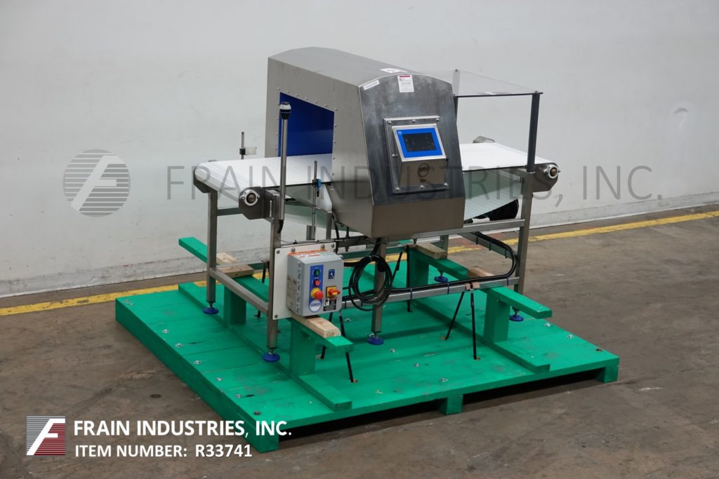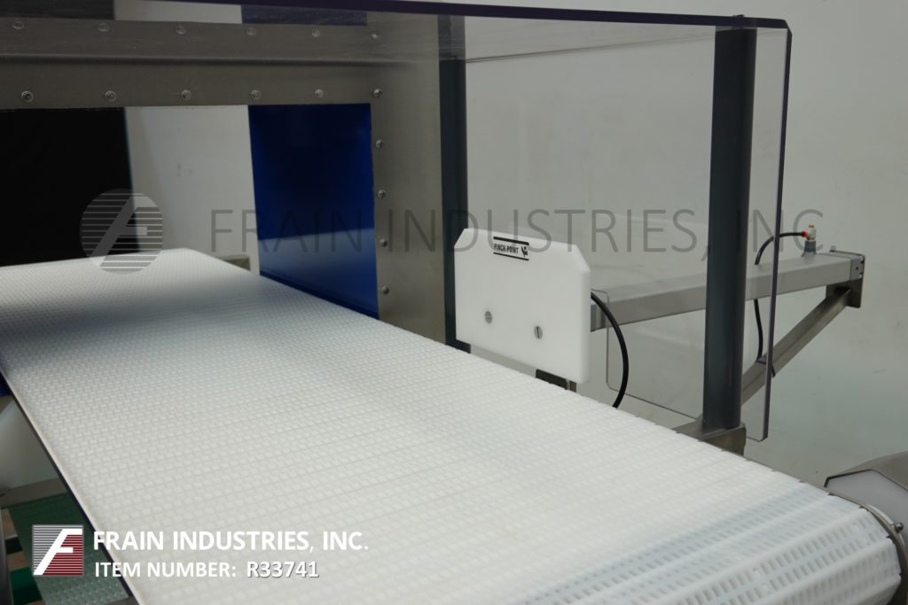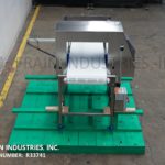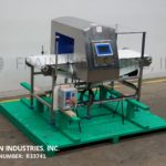 Back to All EquipmentLoma, Model IQ4, automatic, in line, stainless steel, metal detector with number of product per minute – depending on materials and application. Working Aperture: 12½" in Height; 21½" in Width. Equipped with 19¾" wide x 70" long white flex link product conveyor with push arm reject. Sensitivities: depending on product, container and enviorment being run in. Touch pad controls with display. Mounted on (4) leg base frame.