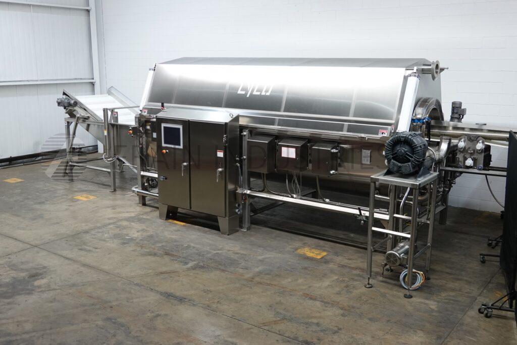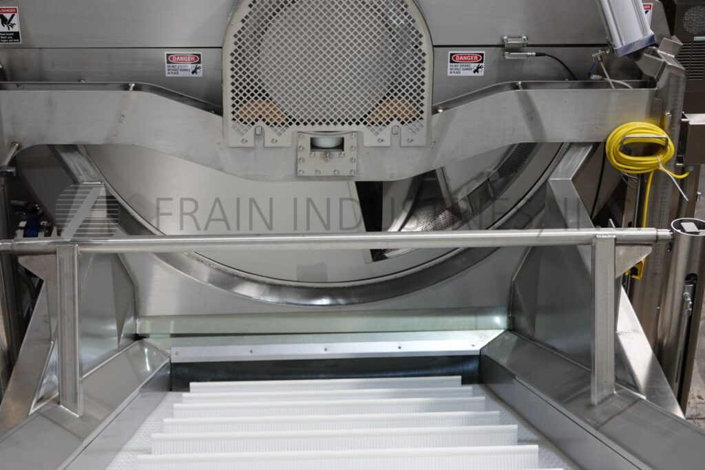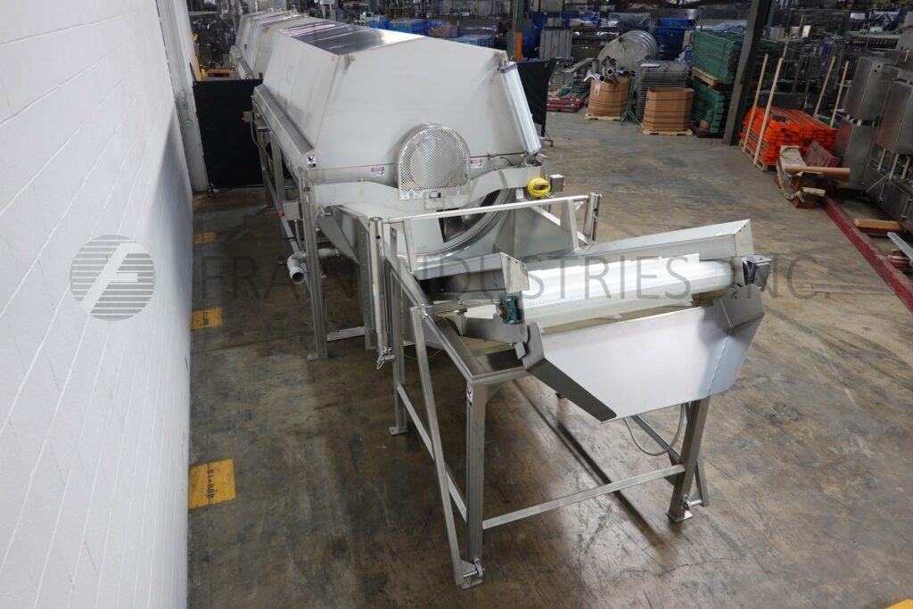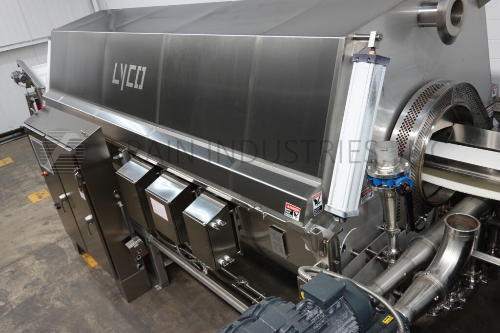 Back to All EquipmentLyco, Model Chill-Flow pouch cooler rotary system with pounds of product per hour – depending on materials and application. Stainless steel contact parts. Equipped with 72" OD x 192" Long perforated drum powered by a 1 HP drive, 24" diameter charge and end discharge with 45" wide x 130" long take away belt with 2" high cleats set on 12" centers and a 77" discharge height. Mounted on heavy duty stainless steel base frame with 3 hp centrifugal pump and 15 hp blower.