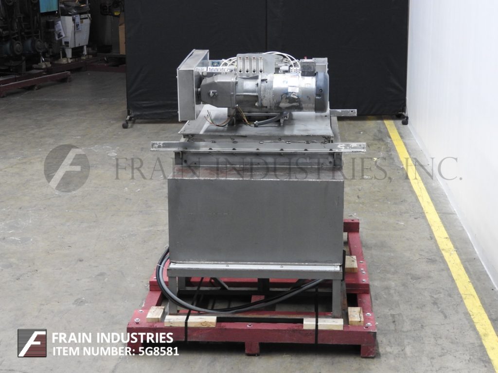 Back to All EquipmentMachine and Process Design Inc, de-lumper and auger feeder. Equipped with a 12" diameter charge port, fixed blade de-lumper powered by a 10 hp drive, 57" long x 35" wide x 15" deep hopper, (2) 64" long x 9" diameter carbon steel screw conveyors on 3" diameter shafts with 5" centers powered by (2) 1 hp drives. Unit has a bolt down cover with a 1½" NPT inlet and (2) 6" diameter discharge chutes.