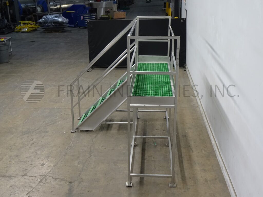 Back to All EquipmentStainless steel mezzanine equipped with a 120" x 30" standing platform set 57" off the ground, (6) step staircase and 34" high guard rail.