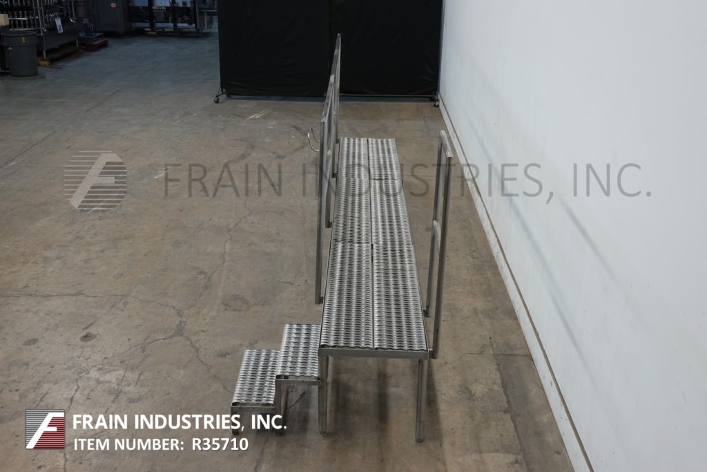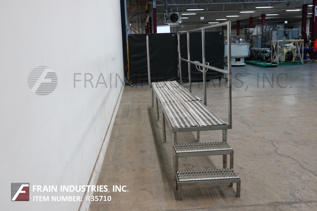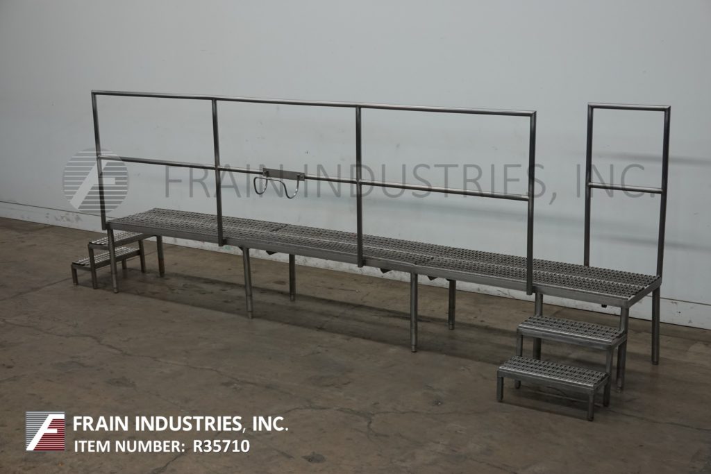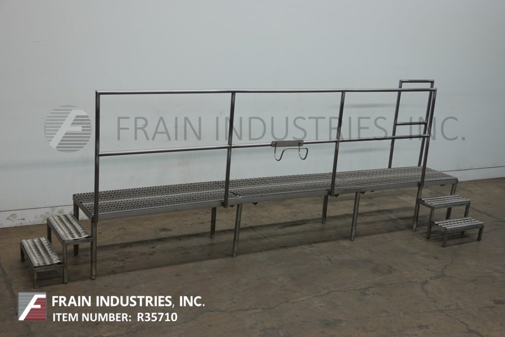 Back to All EquipmentStainless steel mezzanine equipped with a 180" x 24" standing platform set 24" off the ground, (2) step staircase each side and 44" high guard rail.